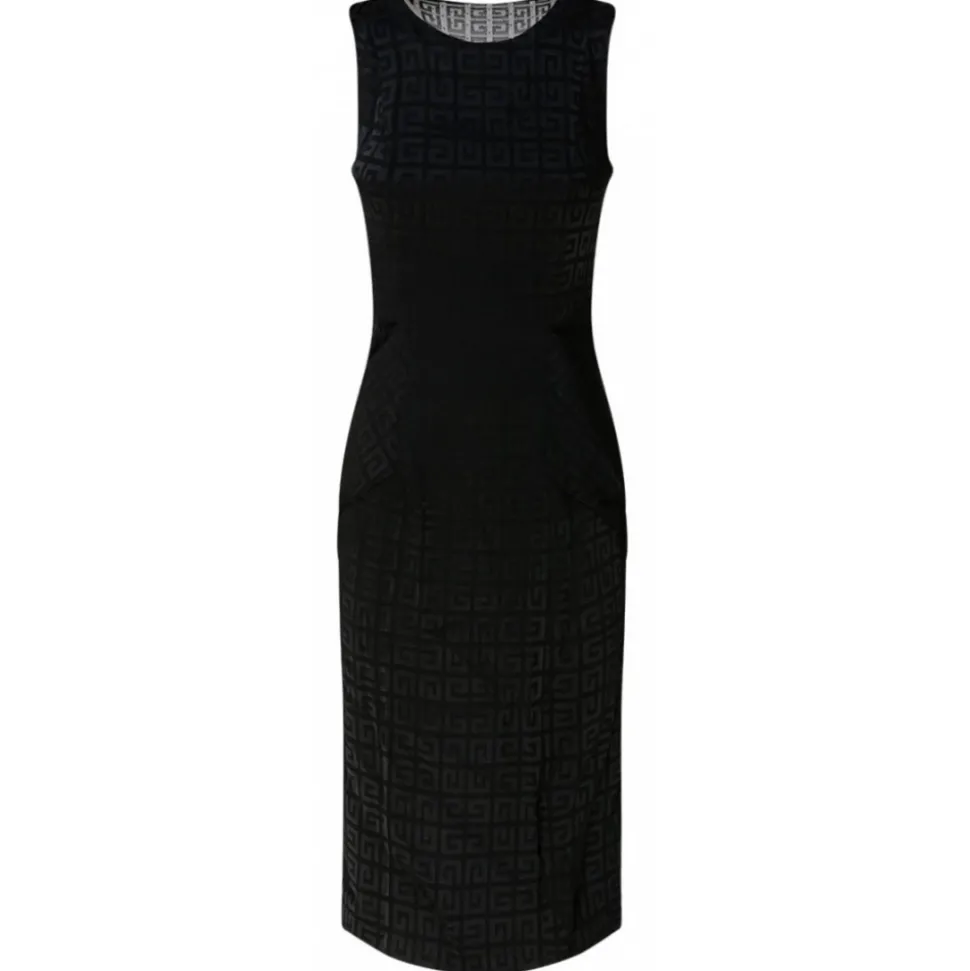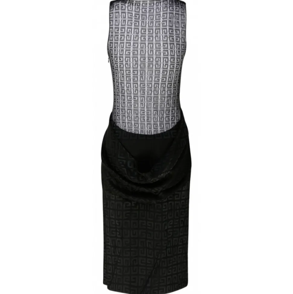 Givenchy Black 4G Jacquard with Tulle and Drape Dress. Black jacquard dress, sleeveless, mid-length, all over 4G pattern, transparent tulle with 4G pattern all over and drape in the back, invisible zipped closure on the side.
