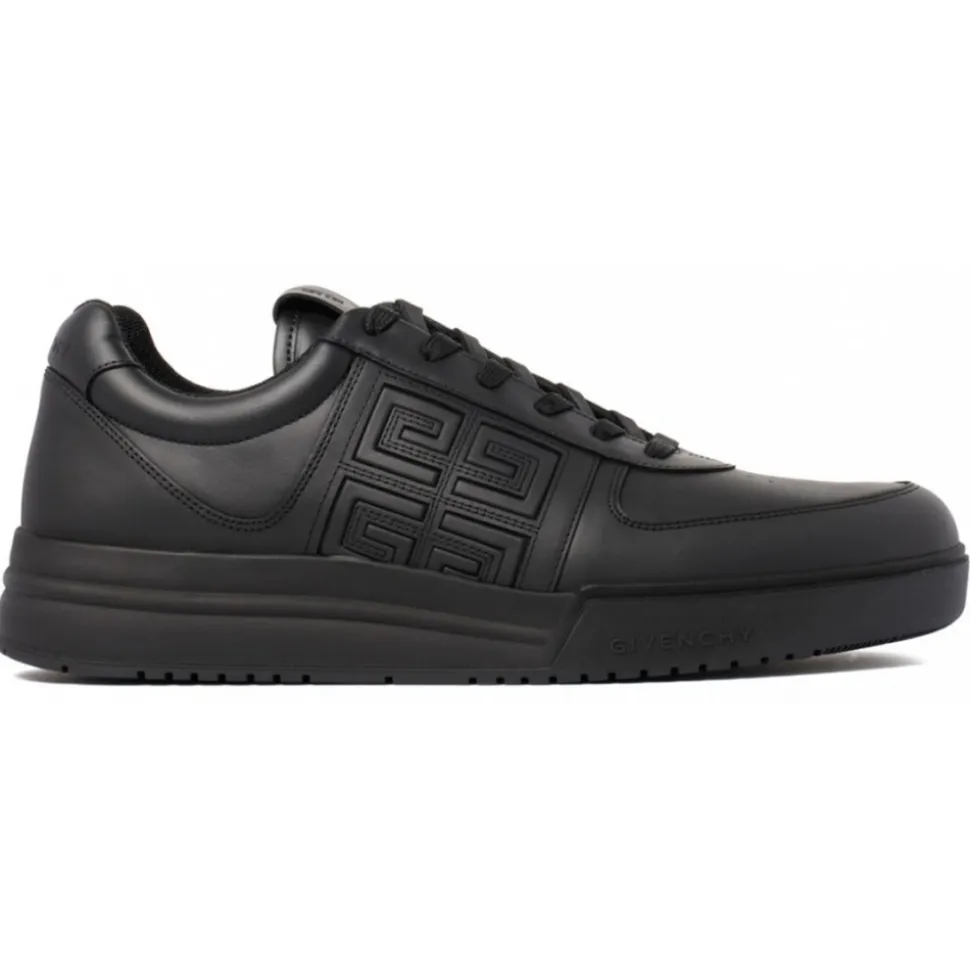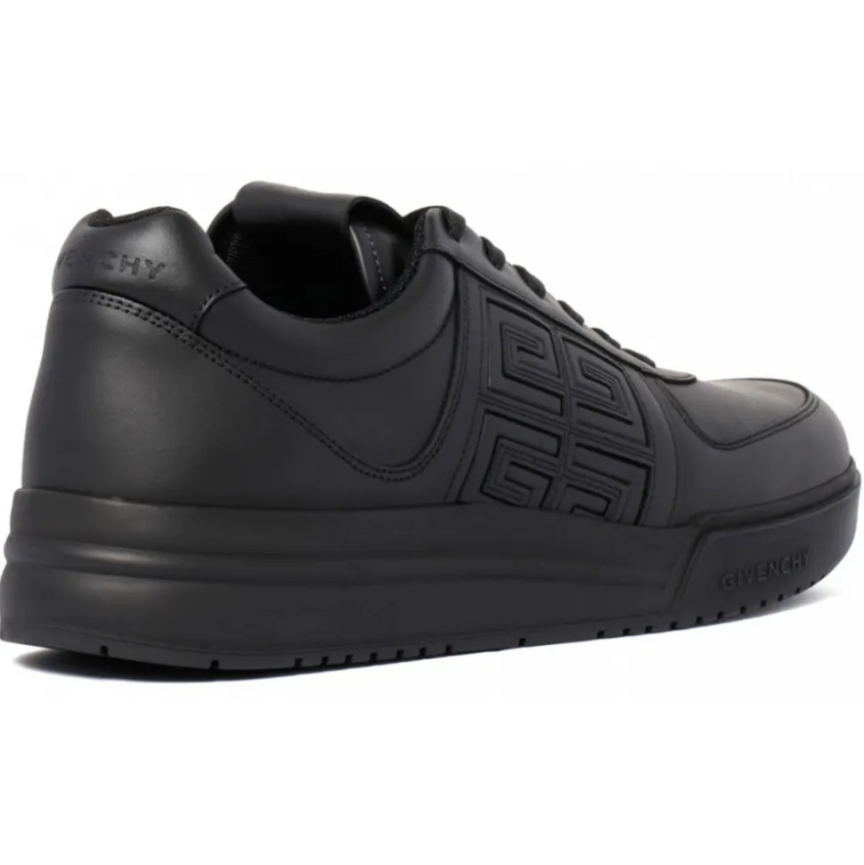 Givenchy Black 4G Signature Sneakers. Black calf leather low top sneakers, 4G motig, logo debossed tongue, branded insole, round toe. Front lace up fastening and flat rubber sole.
