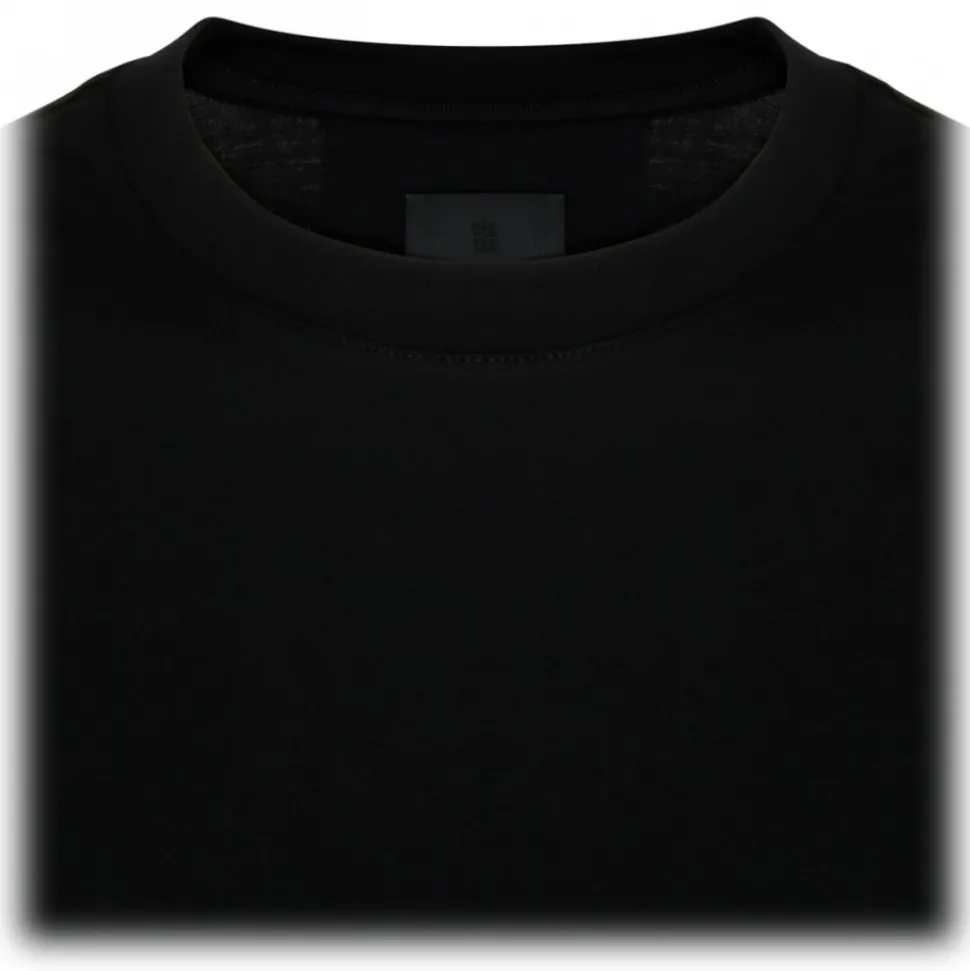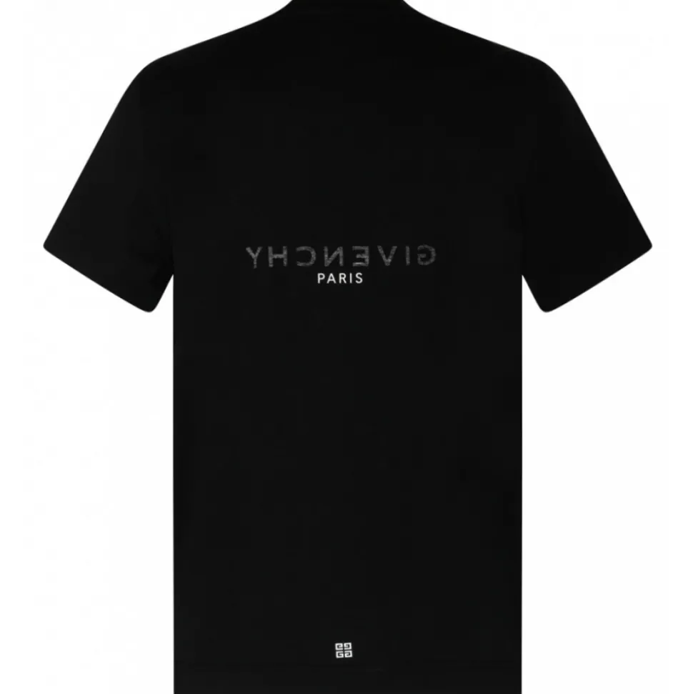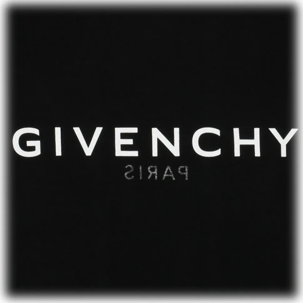 Givenchy Black Logo Print T-Shirt. Black cotton t-shirt, reverse effect logo on the front and back, small white 4G logo print on the back. Short sleeves, crew neck, straight hem.
