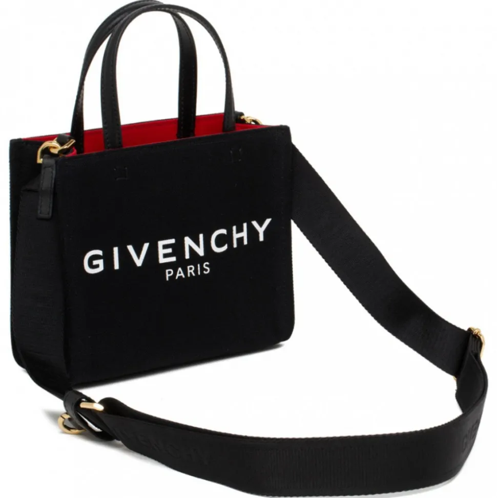 Givenchy Black Mini G-Tote Bag. Black canvas with tone on tone leather profiles tote bag, contrasting logo print. Gold coloured hardware, leather handles and adjustable and removable shoulder strap in logoed fabric. Red canvas interior, leather feet with embossed 4G motif.