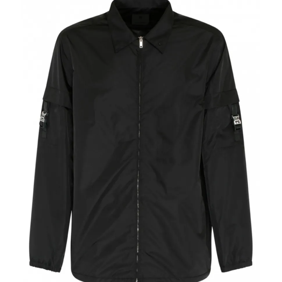 Givenchy Black Nylon Logo Clip Jacket. Black nylon jacket, front zip closure, classic collar. Side pockets, sleeve pockets with logo clips, long sleeves.
