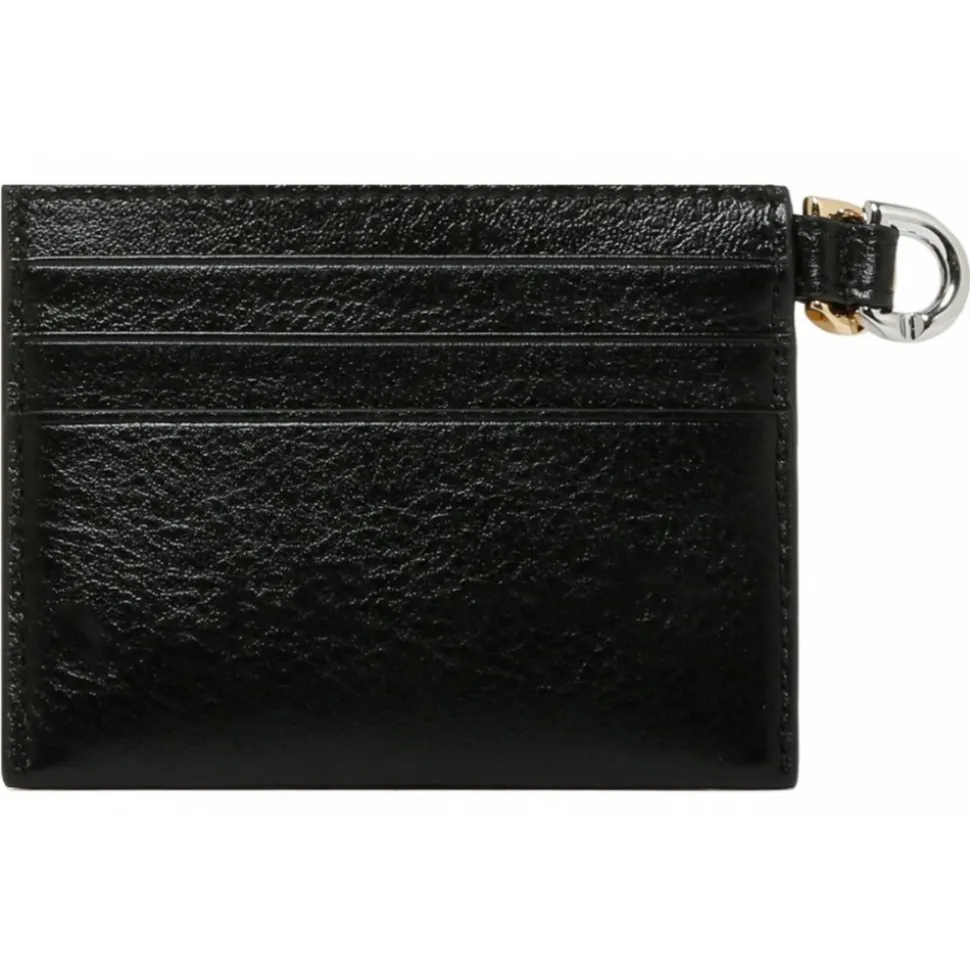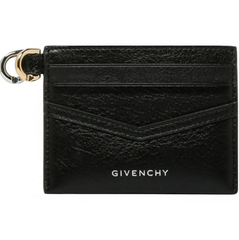 Givenchy Black Voyou Card Holder. Black calf leather card holder, Givenchy signature embossed on the front. Metal D-rings on the side, gold and silver finish metal details. One flat pocket and three card slots on each side.