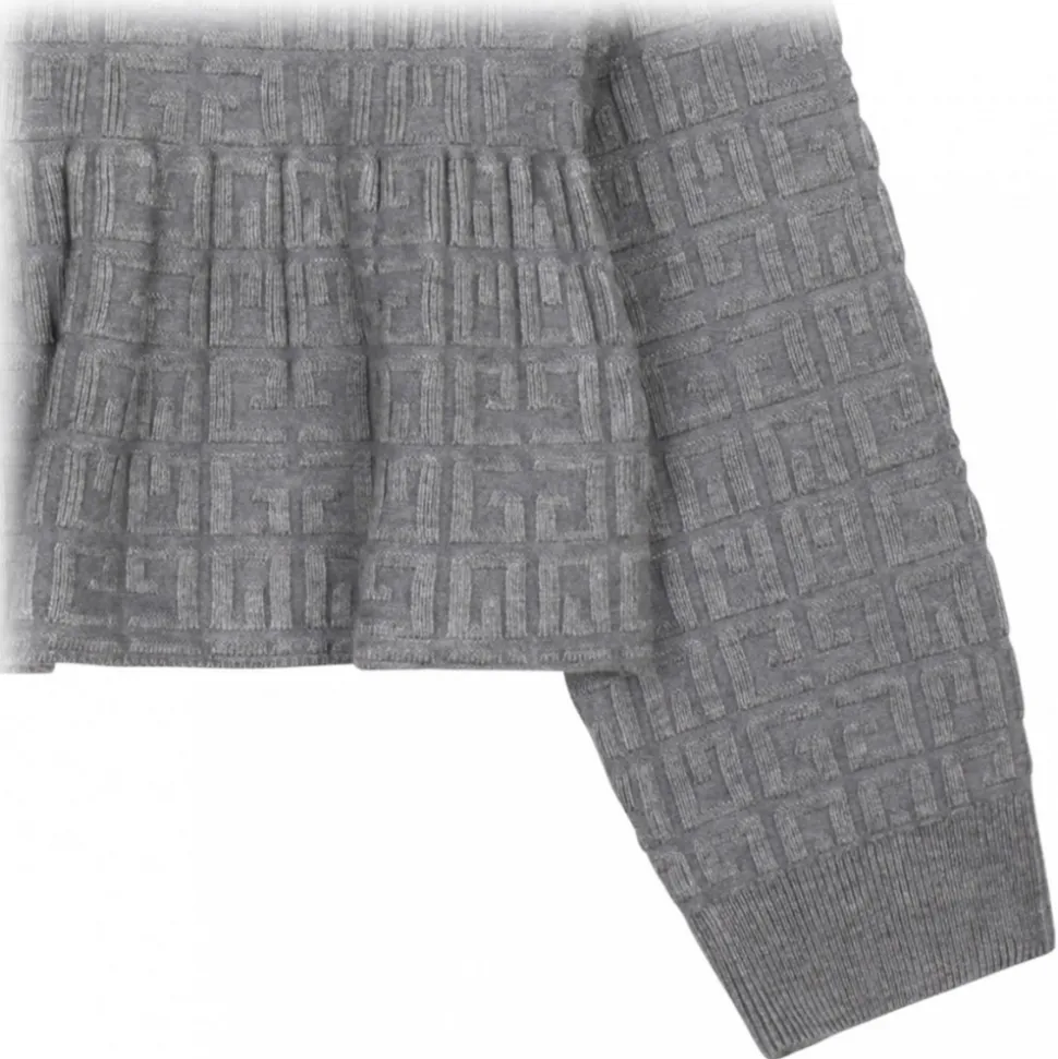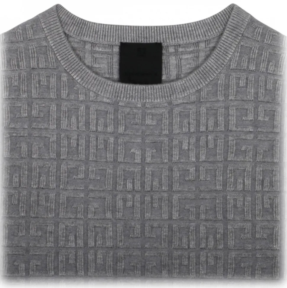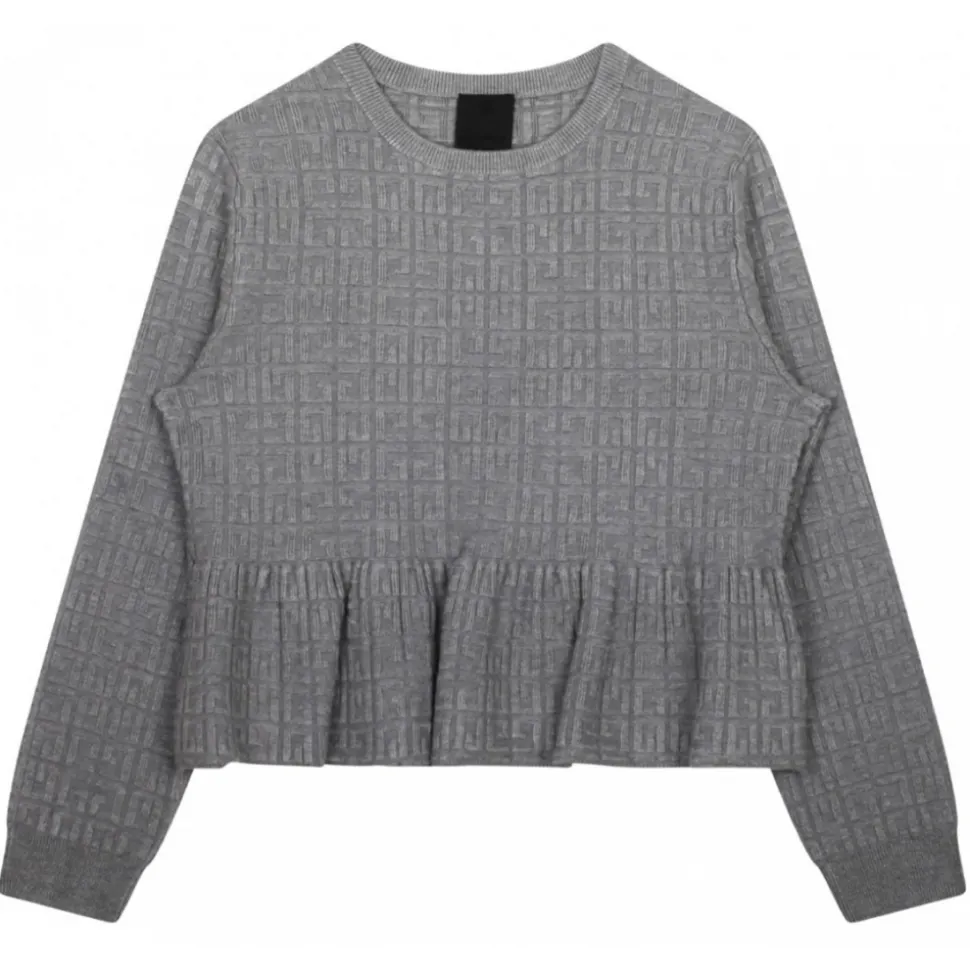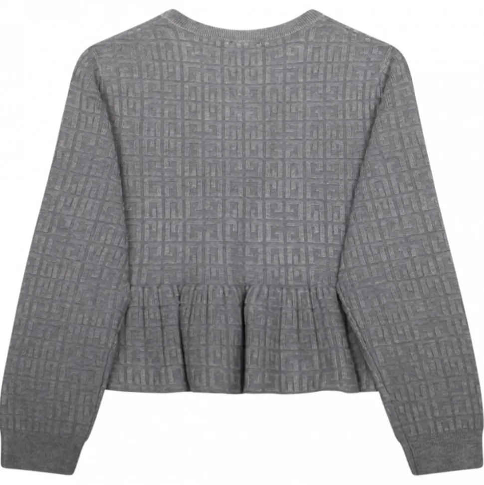 Givenchy Kids Grey Logo Jacquard T-Shirt. Grey stretch design t-shirt, jacquard logo motif, gathered detailing, ribbed band collar. Long sleeves, ribbed cuffs and flared hem.