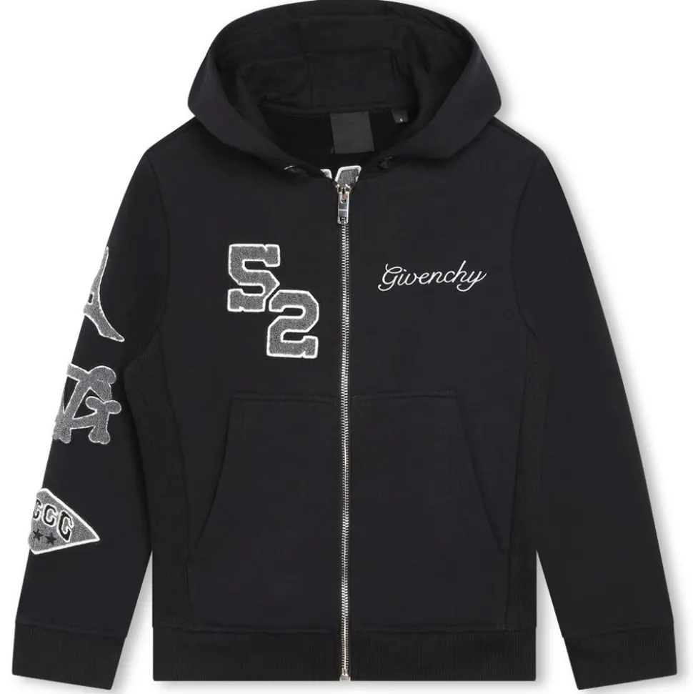 Givenchy Kids Hooded Cardigan Black. Zip fastening, patches on the arm, printed logo on the heart.
