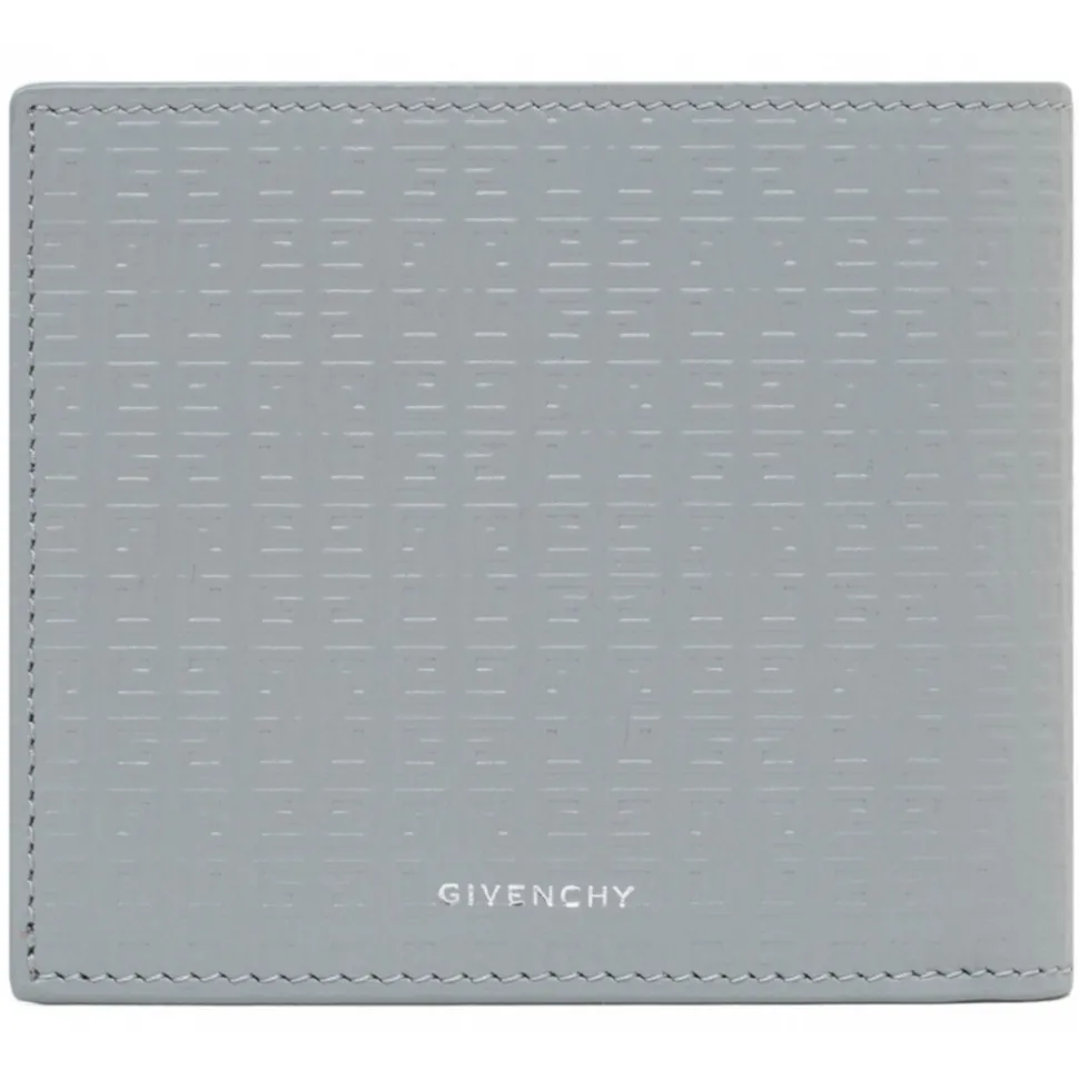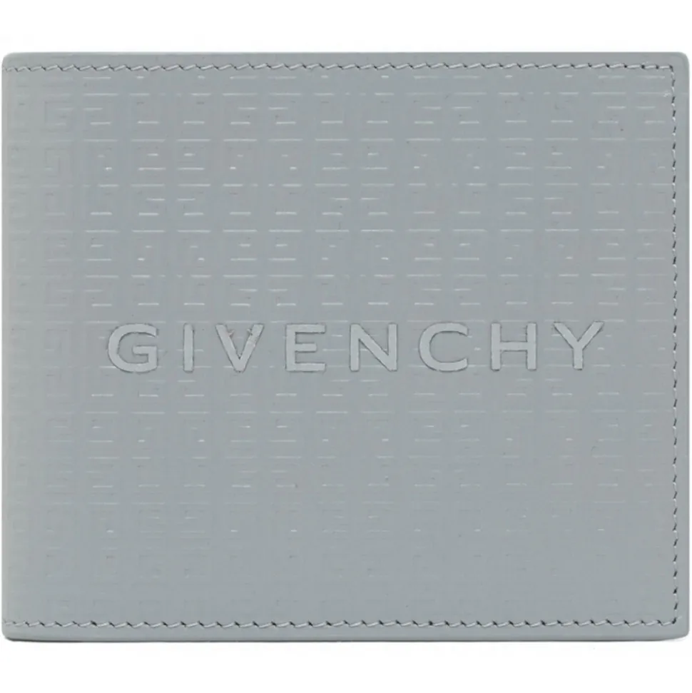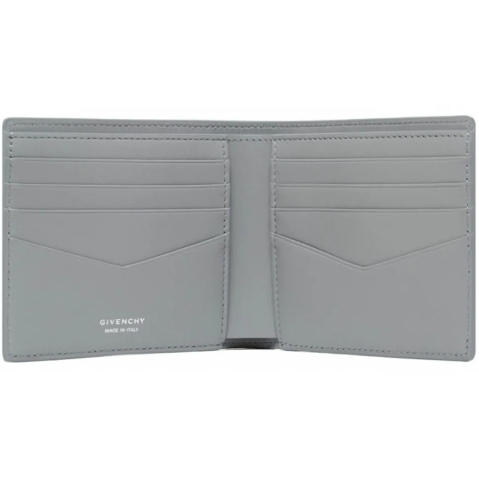Givenchy Light Grey 4G Wallet. Light grey calfskin wallet embossed with 4G motif, Givenchy signature printed on the front. Givenchy signature embossed on the inside, two bill compartments and eight card slots.