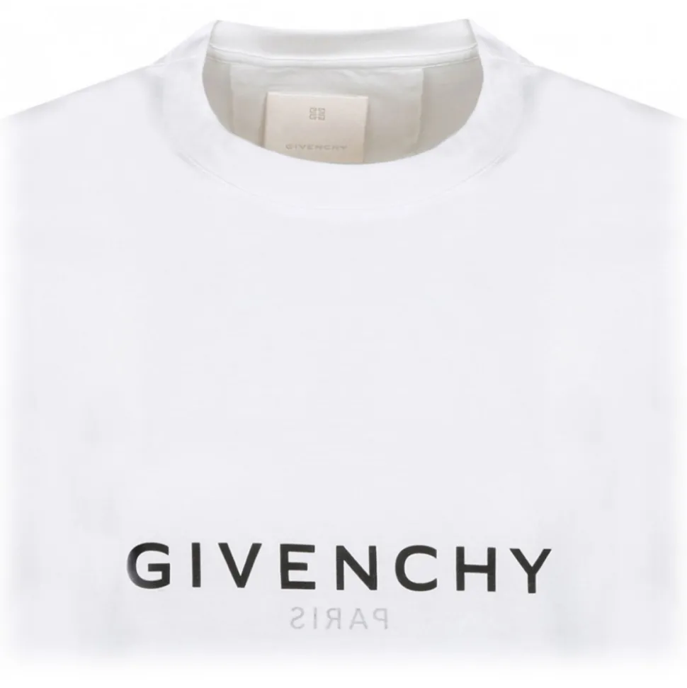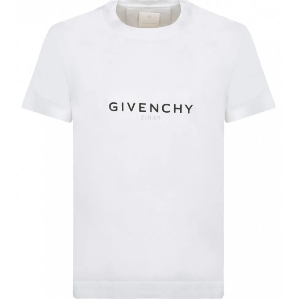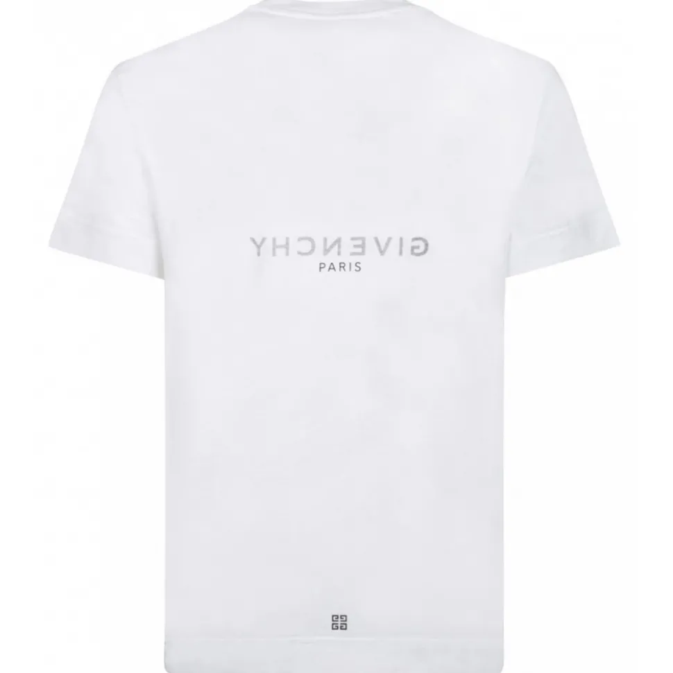Givenchy Stone Grey T-Shirt. Stone grey cotton t-shirt, short sleeves, crew neck, upside down GIVENCHY Paris signature printed on the front and back. Small 4G logo printed on the back at the bottom, slim cut.