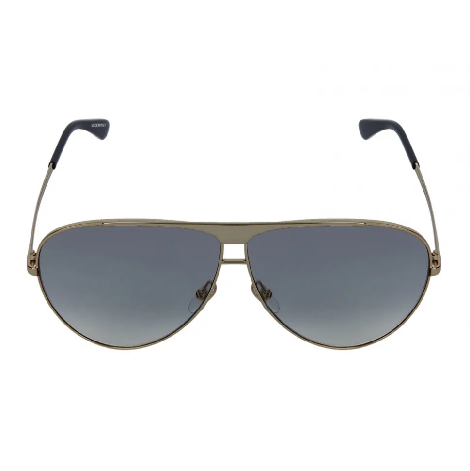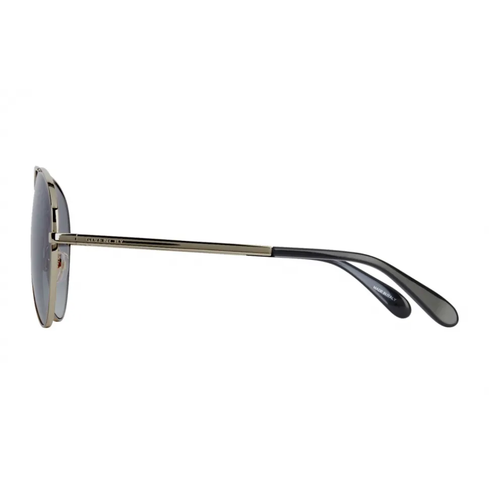 GV Solar unisex teardrop sunglasses in metal with a gold finish, with a graphic bar in solid metal on the bridge, smoked gray lenses and black acetate terminals. Signature GIVENCHY engraved on the left rod. Sold with a hard case.