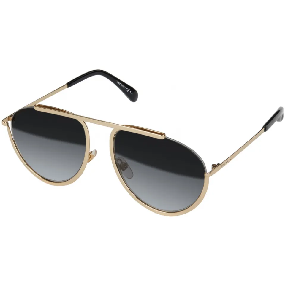 GIVENCHY Fold women’s teardrop sunglasses, with a minimalist metal bridge frame in gold finish, shaded gray lenses and black acetate ends. Signature GIVENCHY engraved on the left rod. Sold with a hard case.