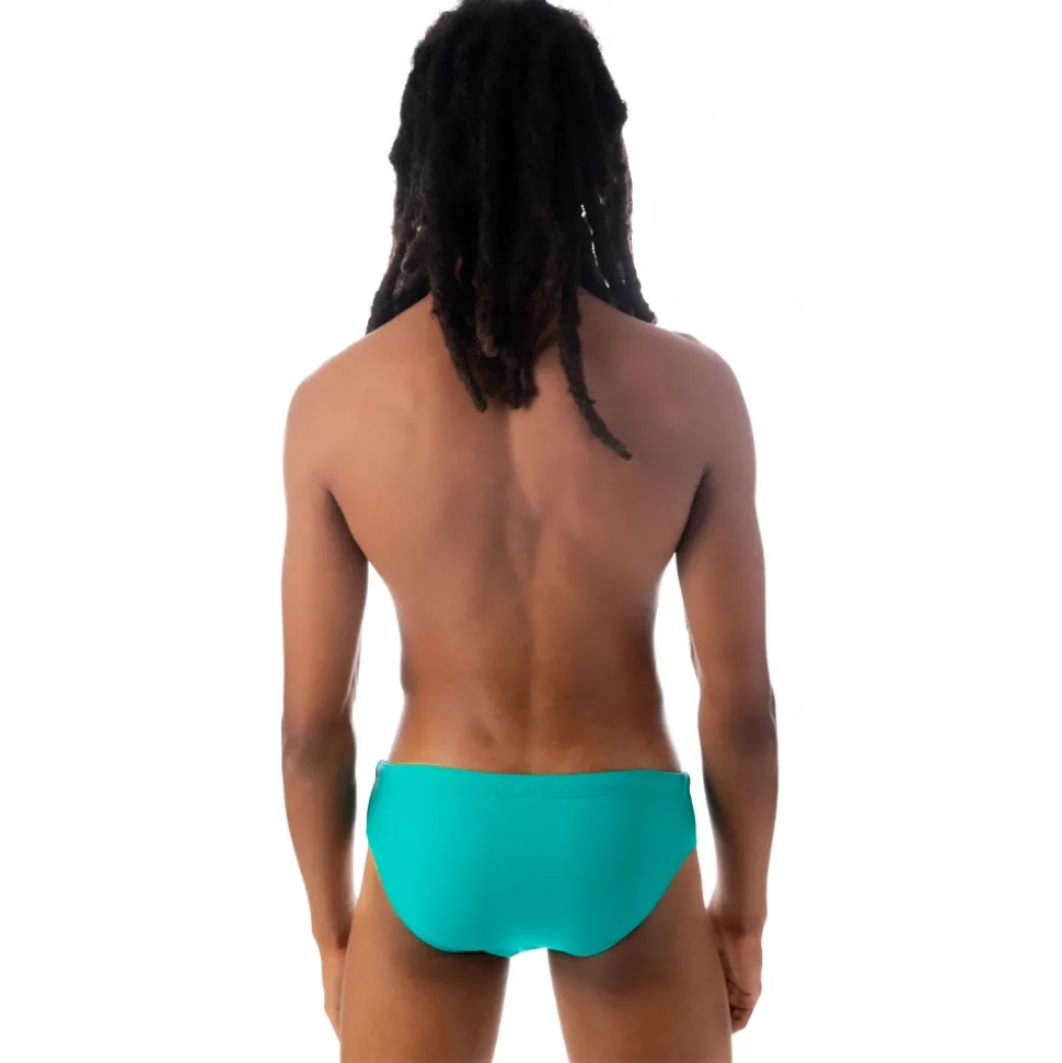 Fluorescent green stretch swim briefs with lace and Grace rainbow logo application.
