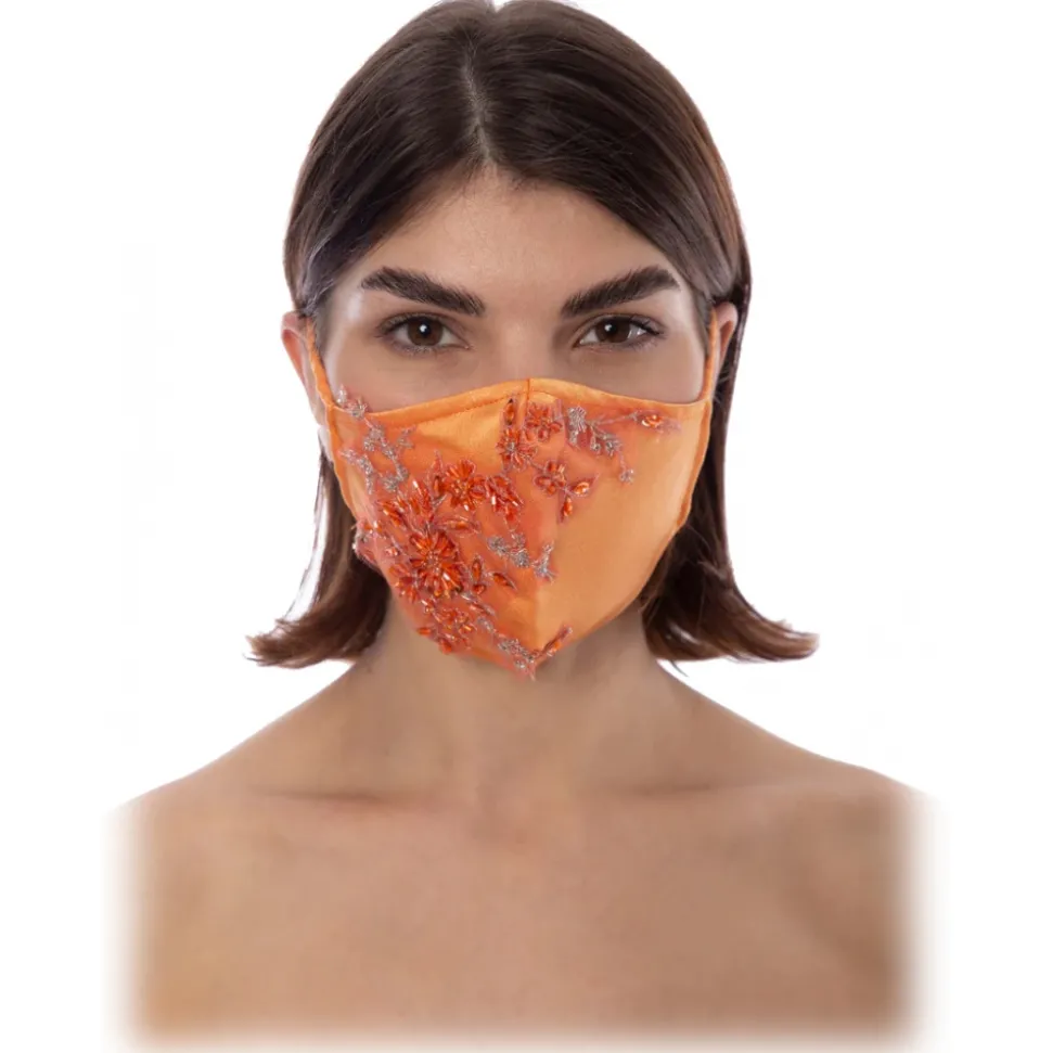 Long fitted mermaid dress in orange silk cady with sweetheart neckline. Orange embroidered lace detail on the décolleté and across the back. Pattern of small buttons on the center back that hide the practical zip closure. Separate three-quarter sleeves in orange embroidered lace. Coordinated mask in orange embroidered lace.