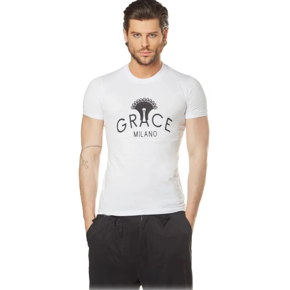 Unisex white crew-neck t-shirt in 100% cotton. Medium fit. Black Grace Milano embroidery on the front.