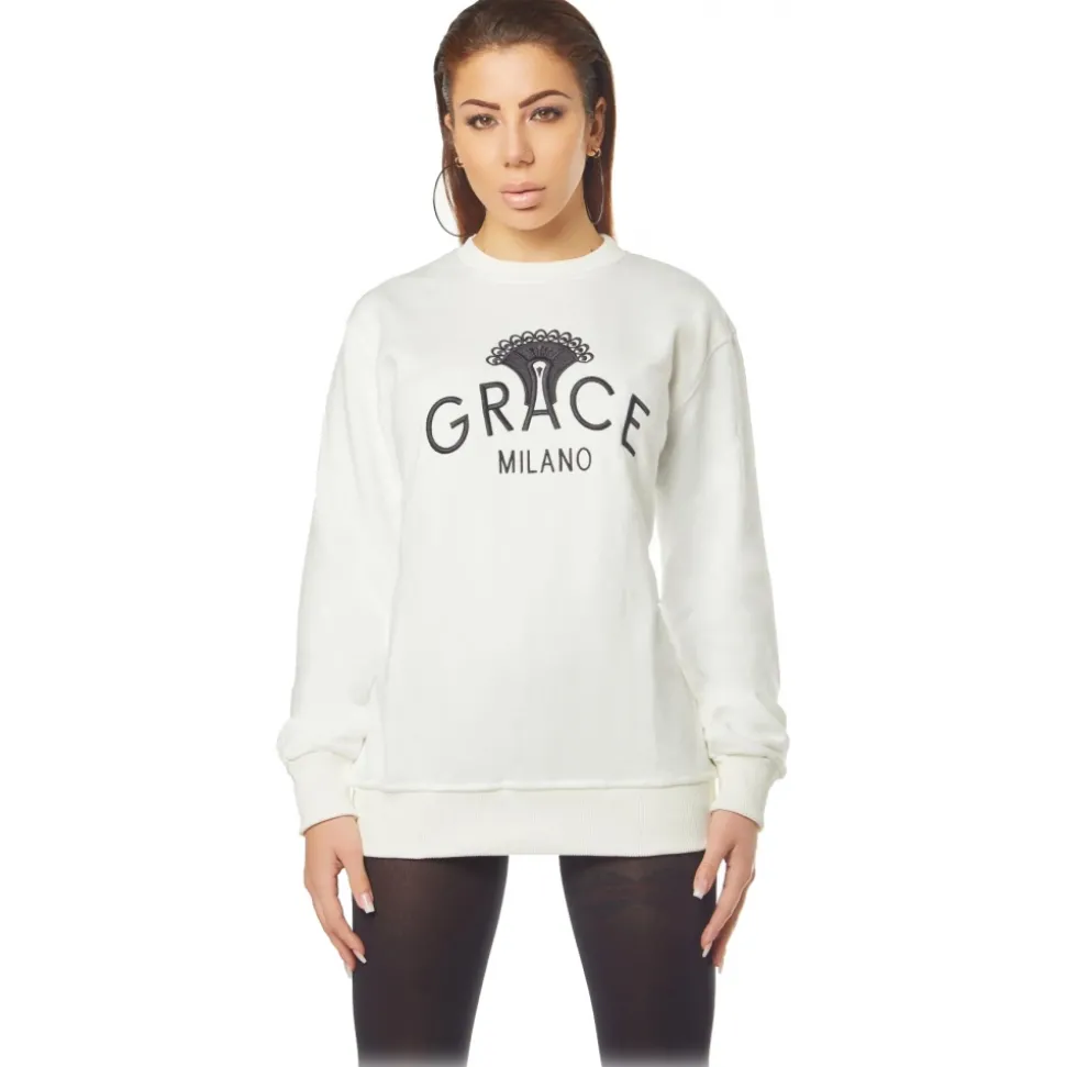 Unisex white crewneck sweatshirt in 100% cotton. Medium fit. Black Grace Milano embroidery on the front.