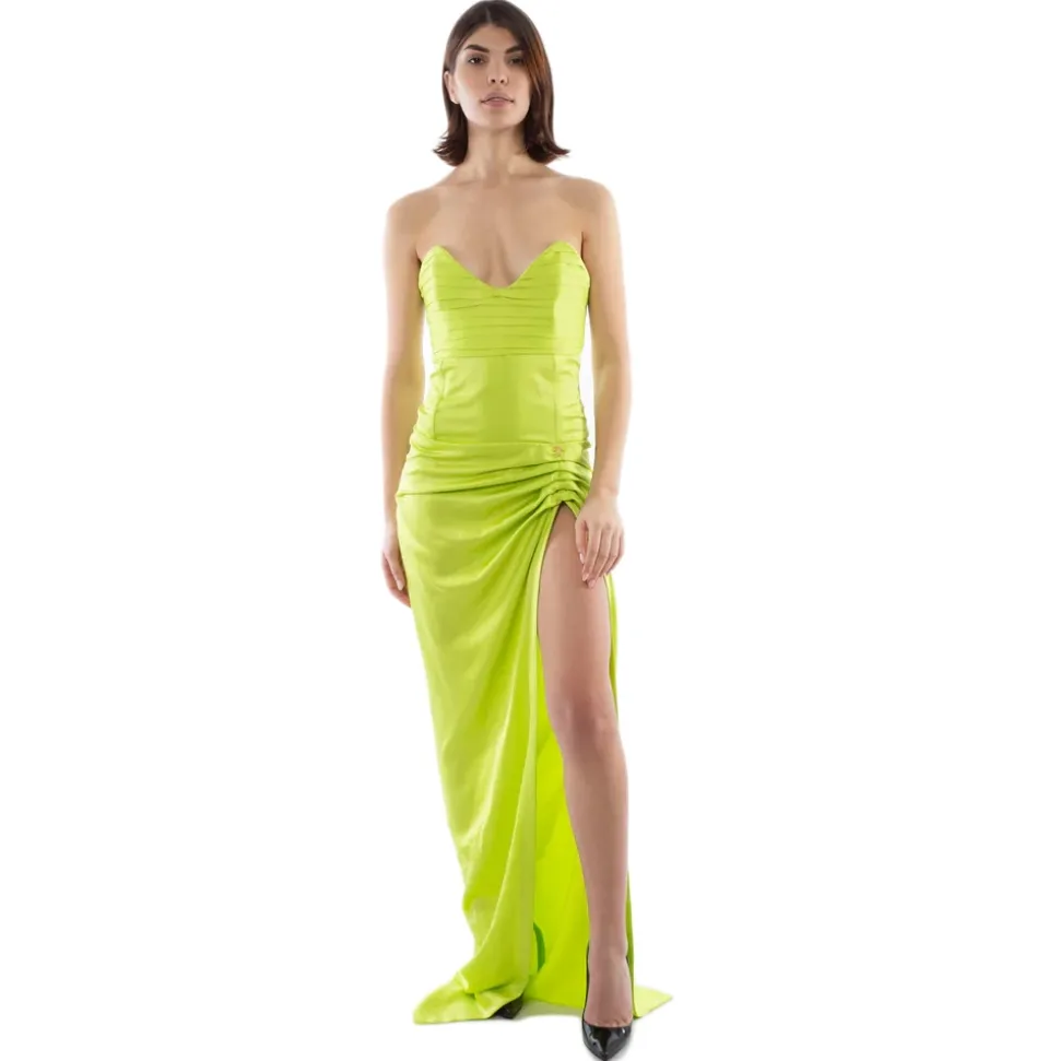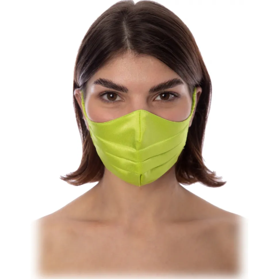Long fitted and asymmetrical dress in lime green silk cady with sweetheart neckline. Horizontal pleating on the décolleté. Gathering with slit on the left side. Back zip. Coordinated mask with lime green pleated detail.