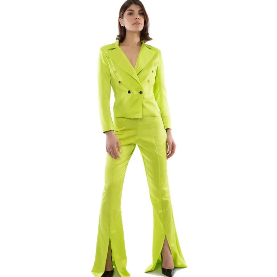 Lime green silk cady trouser suit. Fitted blazer with front buttoning. Slightly flared high-waisted trousers with front cut at the hem. Side zip. Coordinated mask with lime green pleated detail.