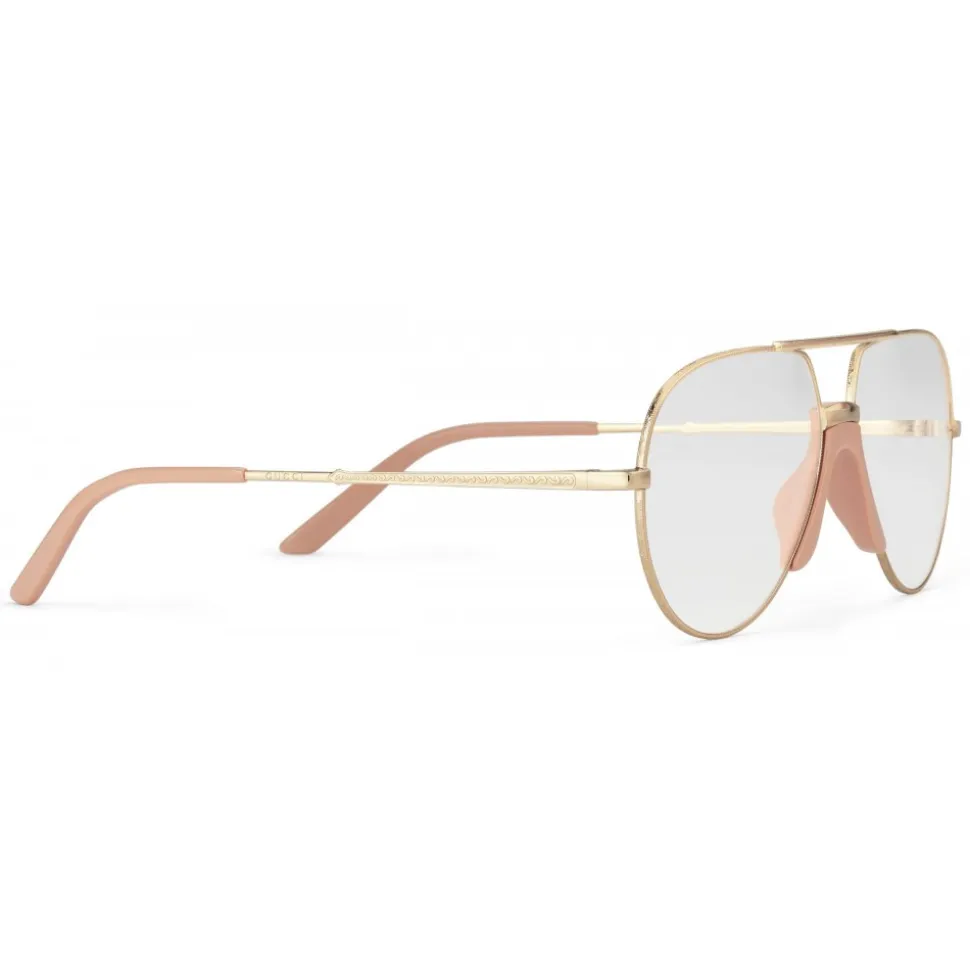 Shiny gold metal temples with Gucci script detail and nude acetate tips