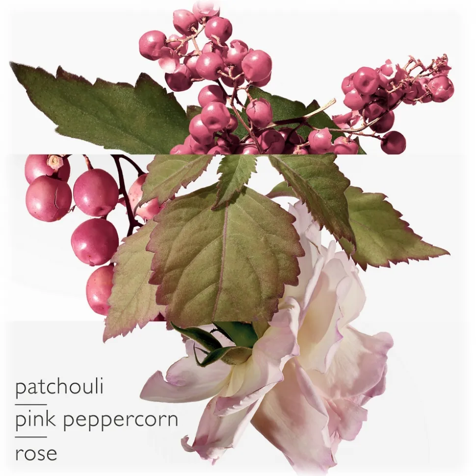 A daring fragrance coloured with vibrant pink peppercorn, tender rose and elegant patchouli. Spicy, floral, woody.