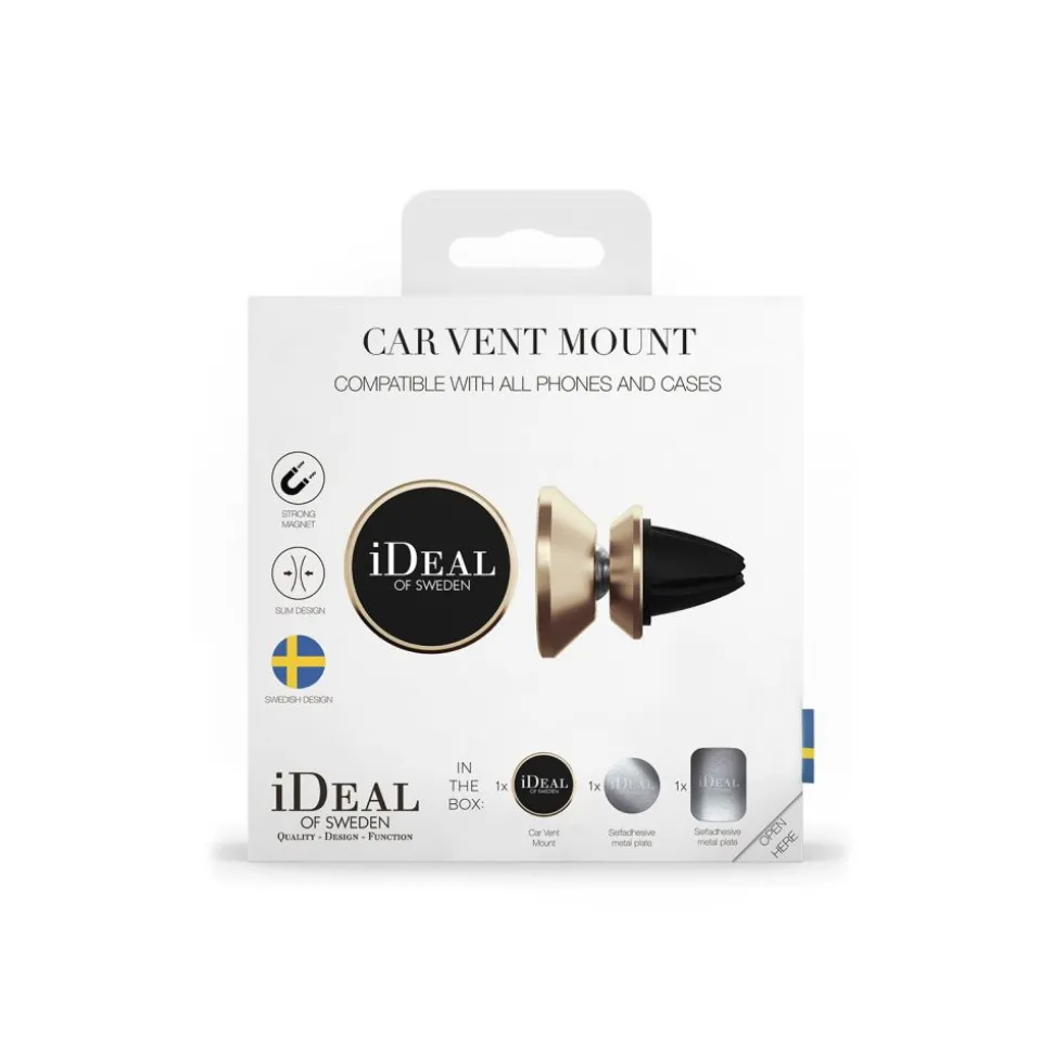 iDeal Car Vent Mount comes with two 3M ultra-thin metal plates which can be placed directly on the device or inside any case. It also works perfectly with any of our magnetic cases and wallets without the need for the metal plates.