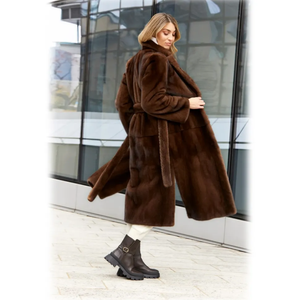 Crafted from premium American saga fur mink, Beatrice features a natural brown hue that adds a touch of warmth and sophistication to your wardrobe. The vertical full leather workmanship, the fur hooks and the fine details such as the lapel collar, the side slits and the mink waist belt give her garment a timeless elegance.