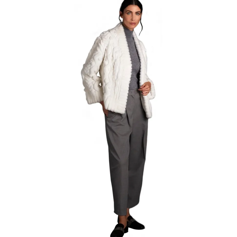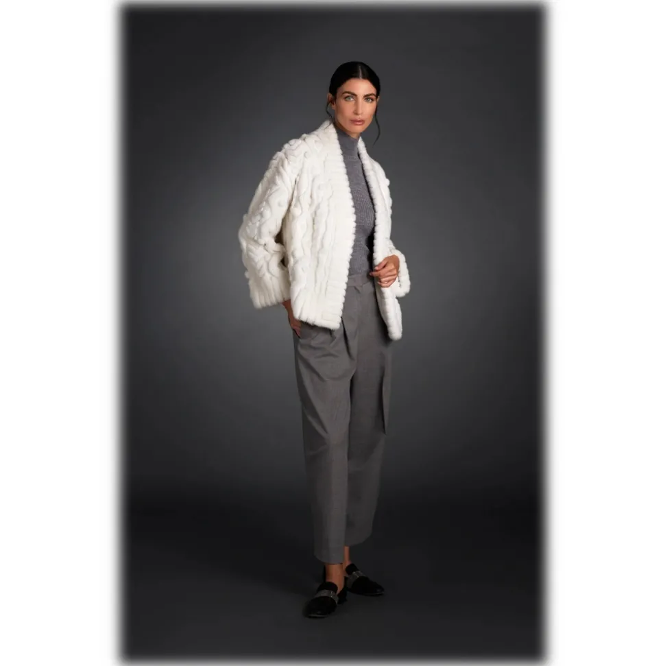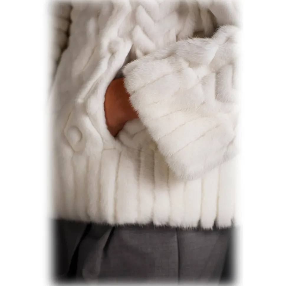 The natural white mink Kopenhagen Fur, worked whole-skin with a shaved mink design with geometric patterns, creates a visually rich and sophisticated structure. The closure with fur hooks adds a refined touch to the fur.