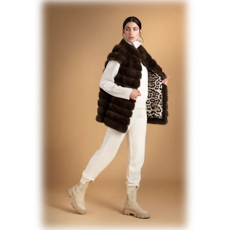 Barguzinsky Russian sable, with a natural dark brown color, is worked horizontally to create an enveloping and rich structure. The closure with fur hooks offers a touch of refinement to the fit.