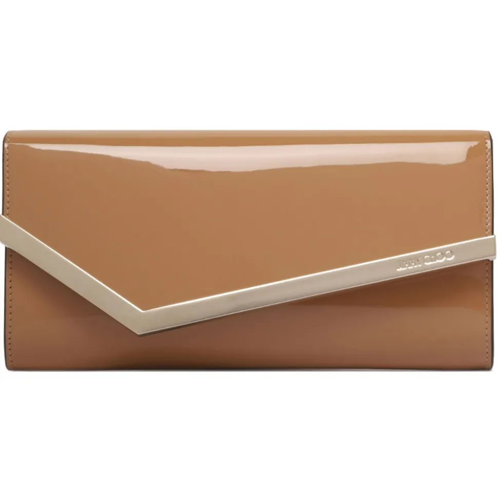 Jimmy Choo Emmie Clutch Bag. Sesame beige and gold tone leather clutch bag, patent finish, detachable chain-link shoulder strap. Main compartment, internal zip-fastening pocket, internal card slots, full lining. Gold-tone hardware, front flap closure, magnetic fastening.