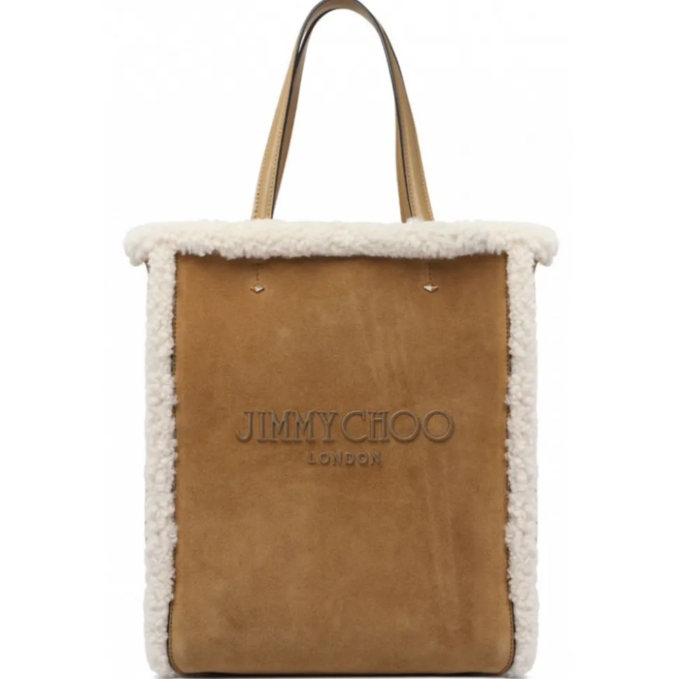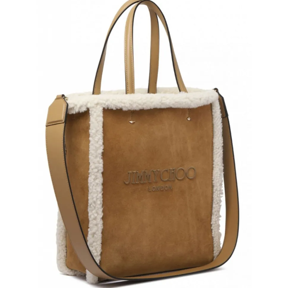 Jimmy Choo Lenny Tote Bag. Tote bag in rattan colour made of suede with shearling trim. Embroidered logo on the front and removable shoulder strap.