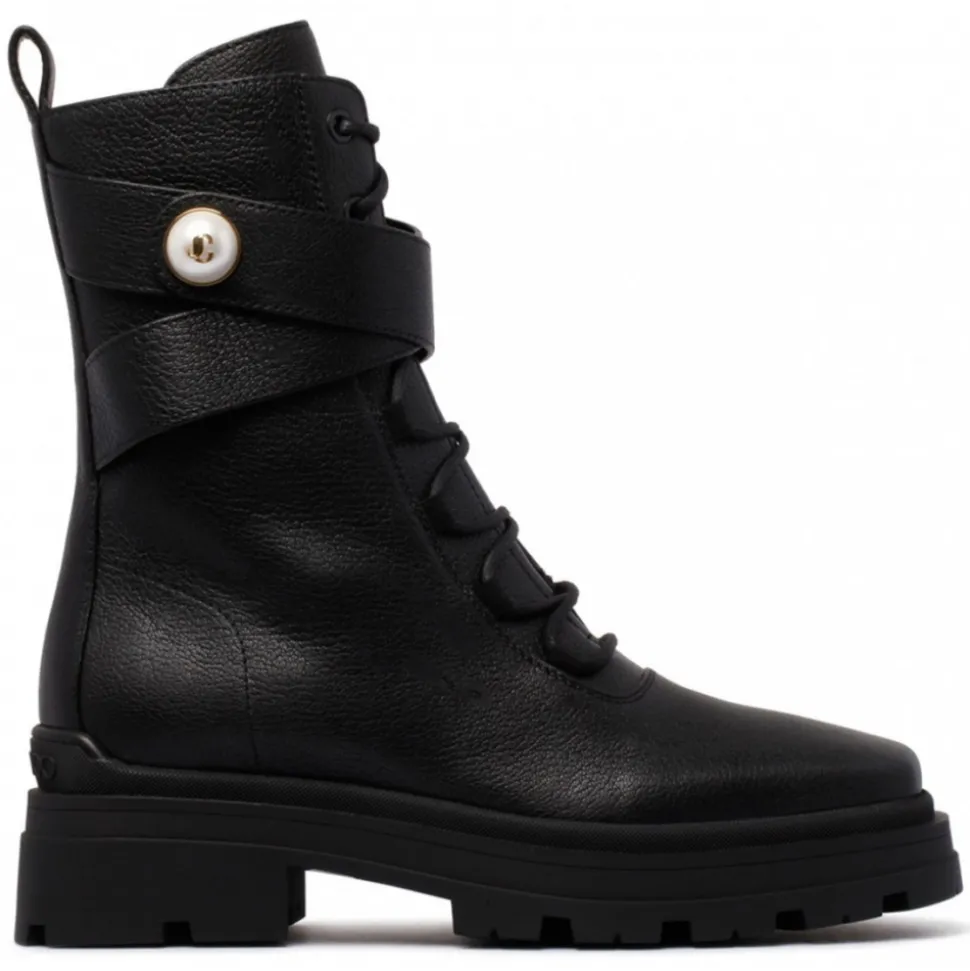 Jimmy Choo Black Noemi Boots. Black calf leather boots, grained texture, strap detailing. Pearl detail with gold tone logo lettering, branded heel counter, square toe. Front lace up fastening, side zip fastening, branded zip puller. Mid calf length, pull tab at the heel, leather lining, chunky rubber lug sole.
