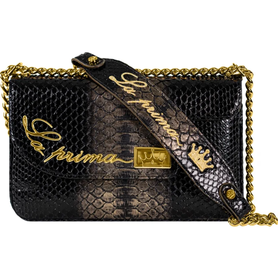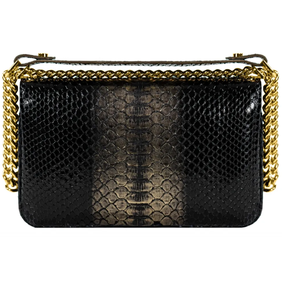 Saddle shoulder bag python hand painted black and bronze color with golden details.