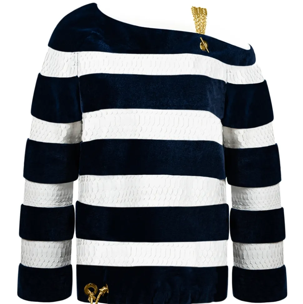 One-shoulder fur in 8 mm shaved blue mink with inserts in optical white python and gold plate chain.