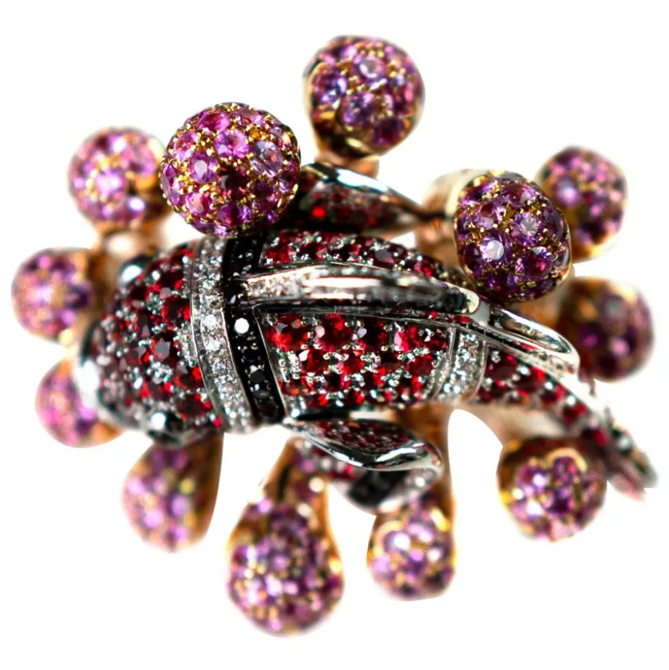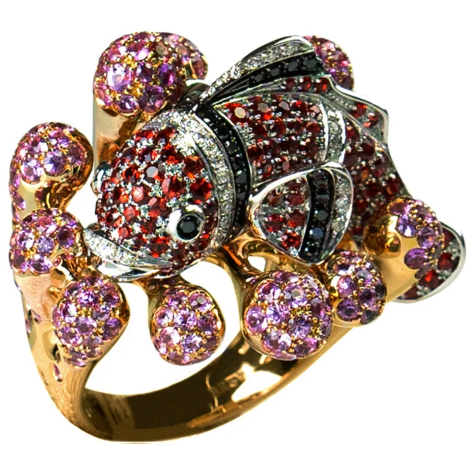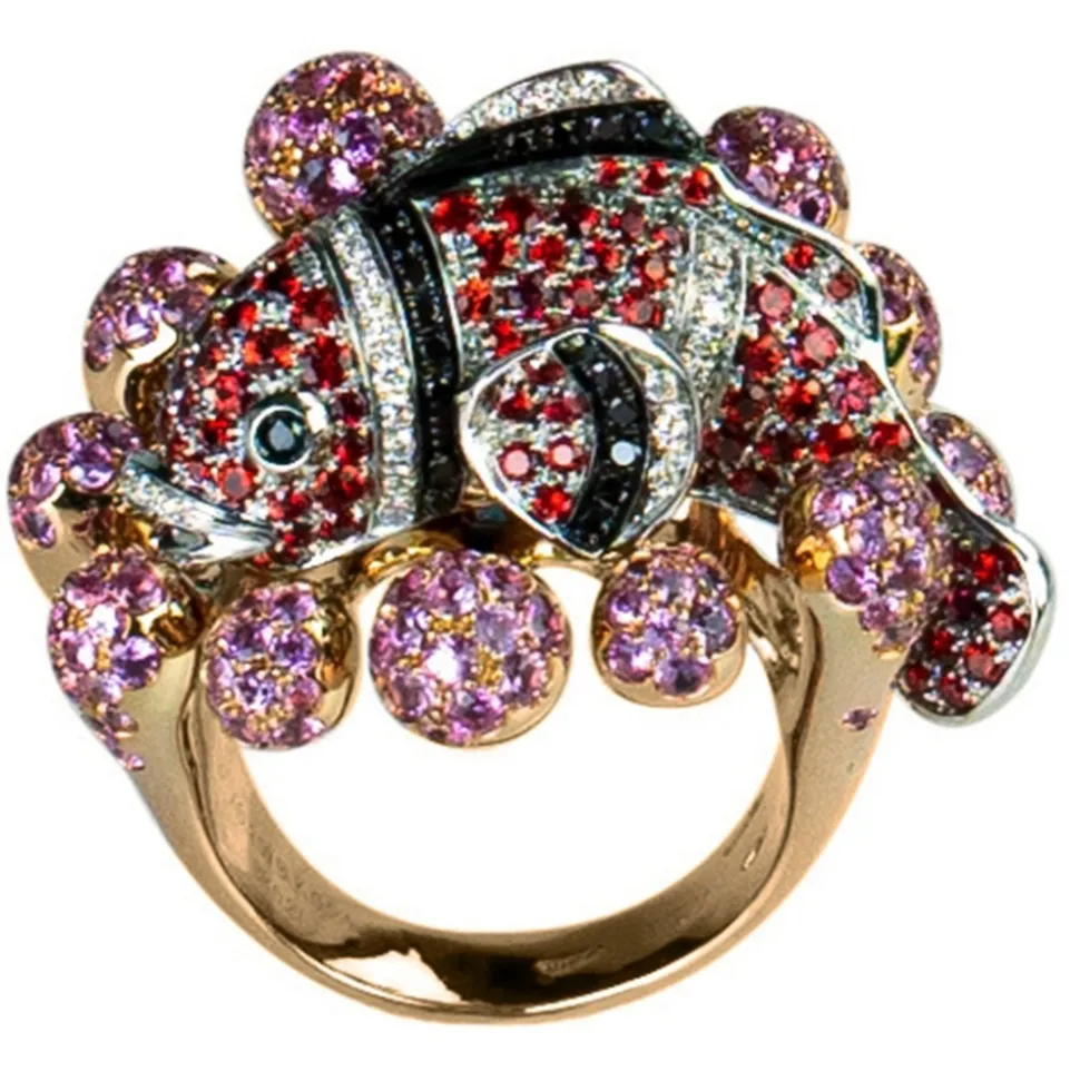 Nemo swims among the corals. His eyes of black diamonds flicker in the red of orange sapphires. He moves happily among small groups of corals created with the magic of pink sapphires. His small fins are glow, resting on a solid base of 30 grams of gold. In its world there is only the beauty and perfection of nature. The Nemo of La Prima shines with 187 orange and pink sapphires, 35 black diamonds and 60 white diamonds. “You will see me from afar” is a promise he keeps!