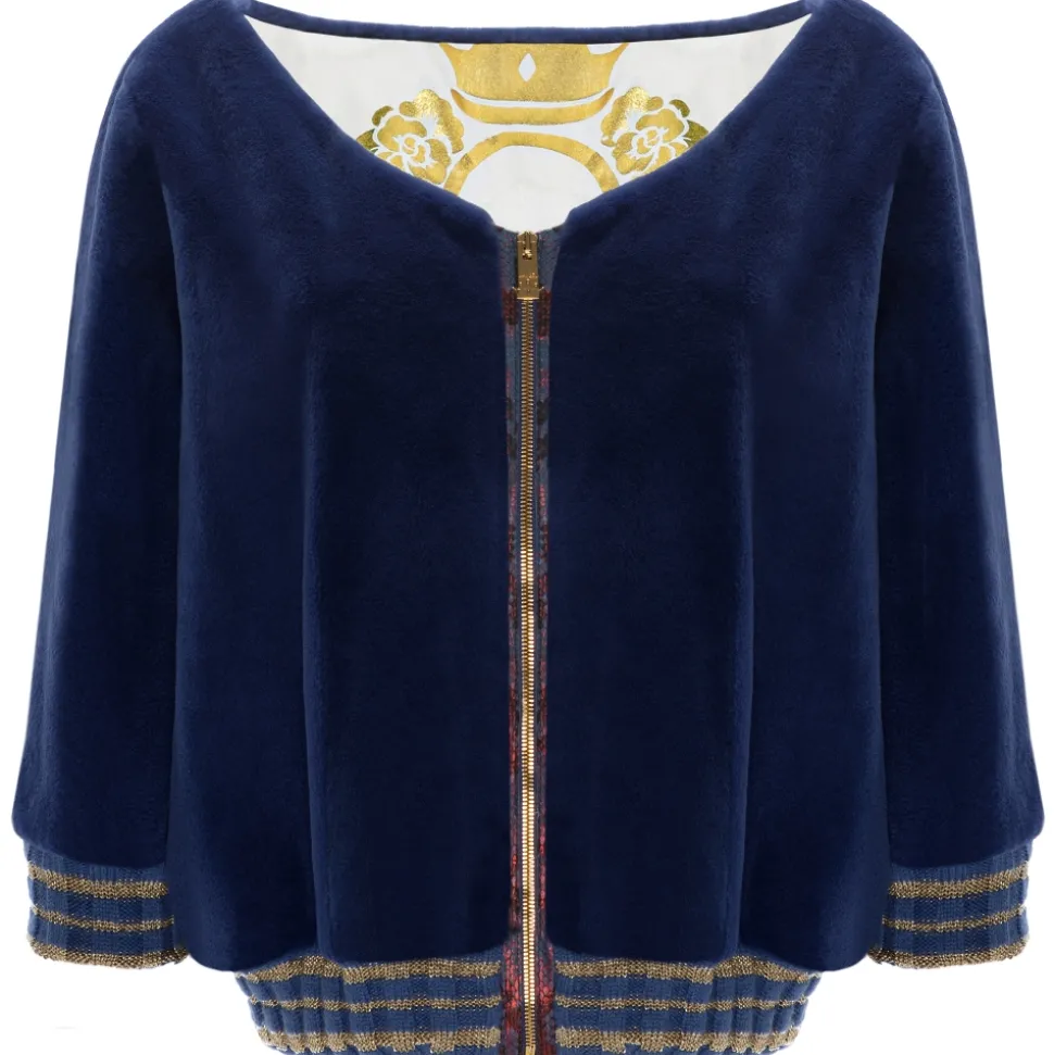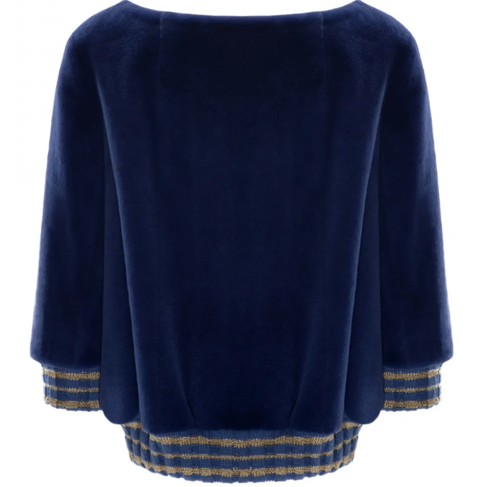 8mm shaved mink fur in navy color with cashmere knit edges and gold thread.