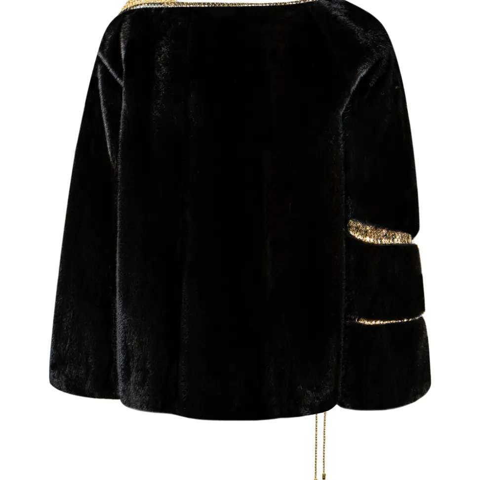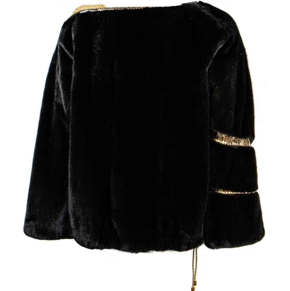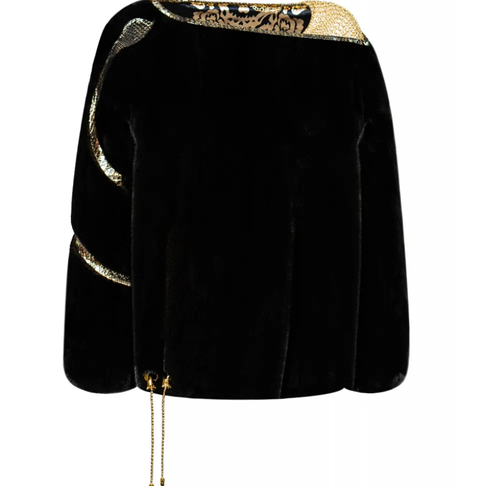 On-shoulder fur coat in blackglama vison with handpainted python inlays and shoulder in golden mesh.