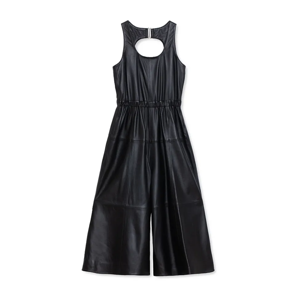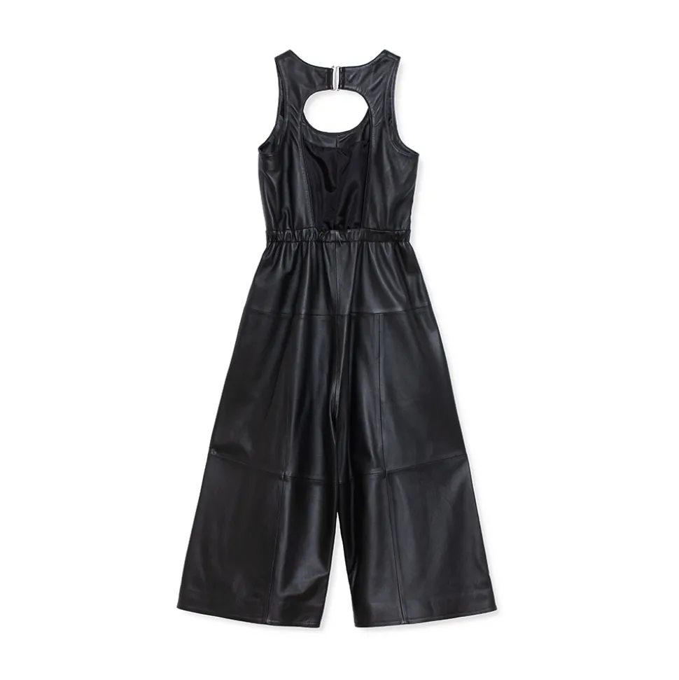 Beccar is our head-turning, wide leg lambskin leather jumpsuit. Features an open back with jeweled buckle closure, an elastic waist and thigh high pockets.