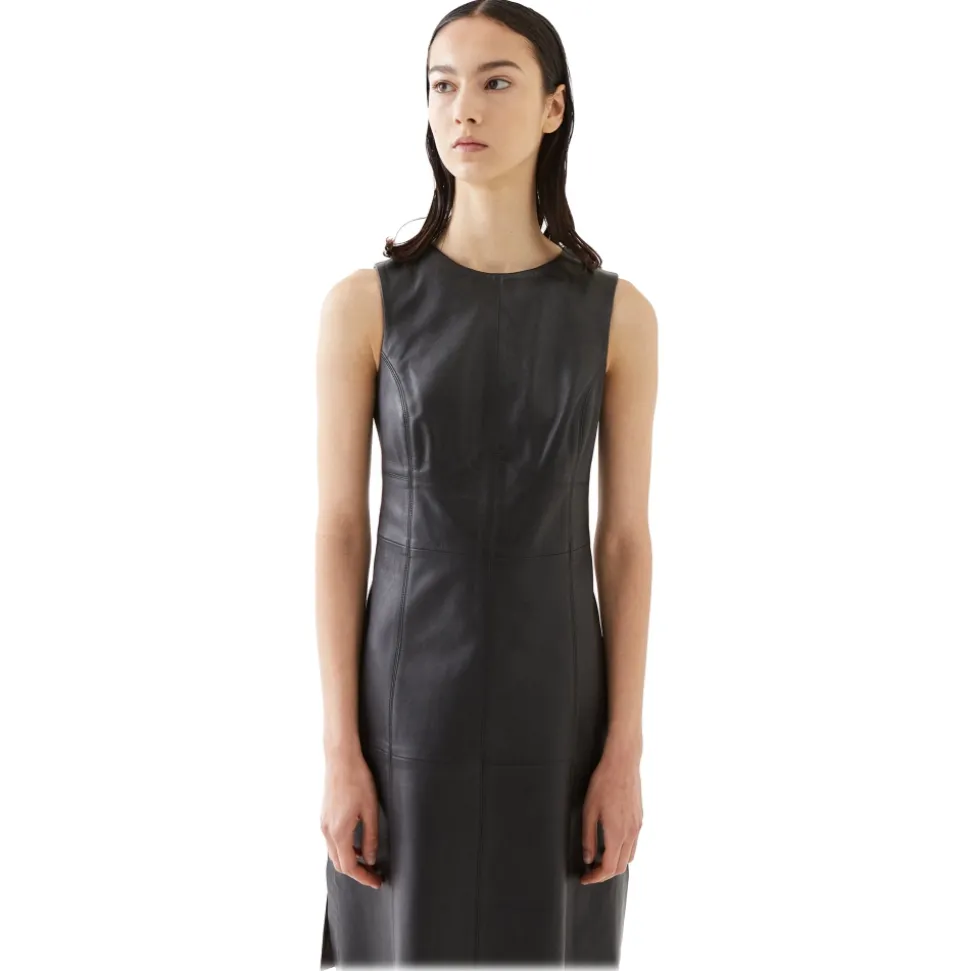 Berazategui is our sleeveless long midi dress with a round neckline, inseam pockets and zip fastening at the back. It is made of soft lambskin leather and it is fully lined.