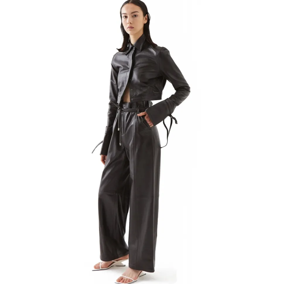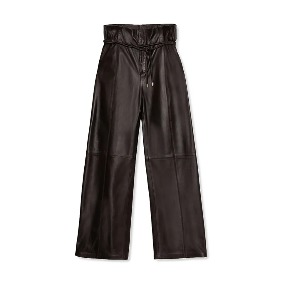 Bernal is our high-waisted straight cut lambskin slacks. Featuring front pockets and leather strap adjusting paper bag waist.