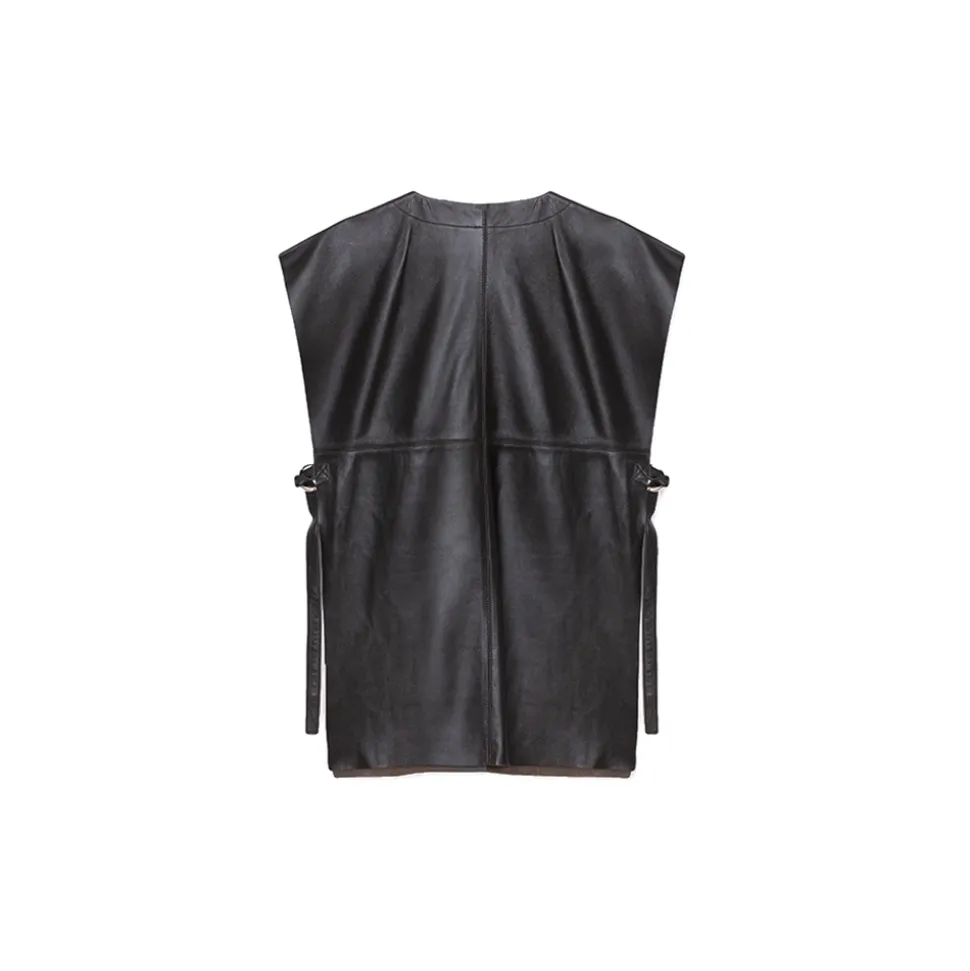 Pergamino is an open side seam tunic. Made of cut lambskin with adjustable leather ties featuring front pocket details.