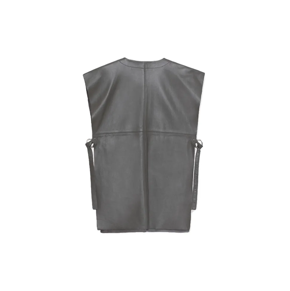 Pergamino is an open side seam tunic. Made of cut lambskin with adjustable leather ties featuring front pocket details.