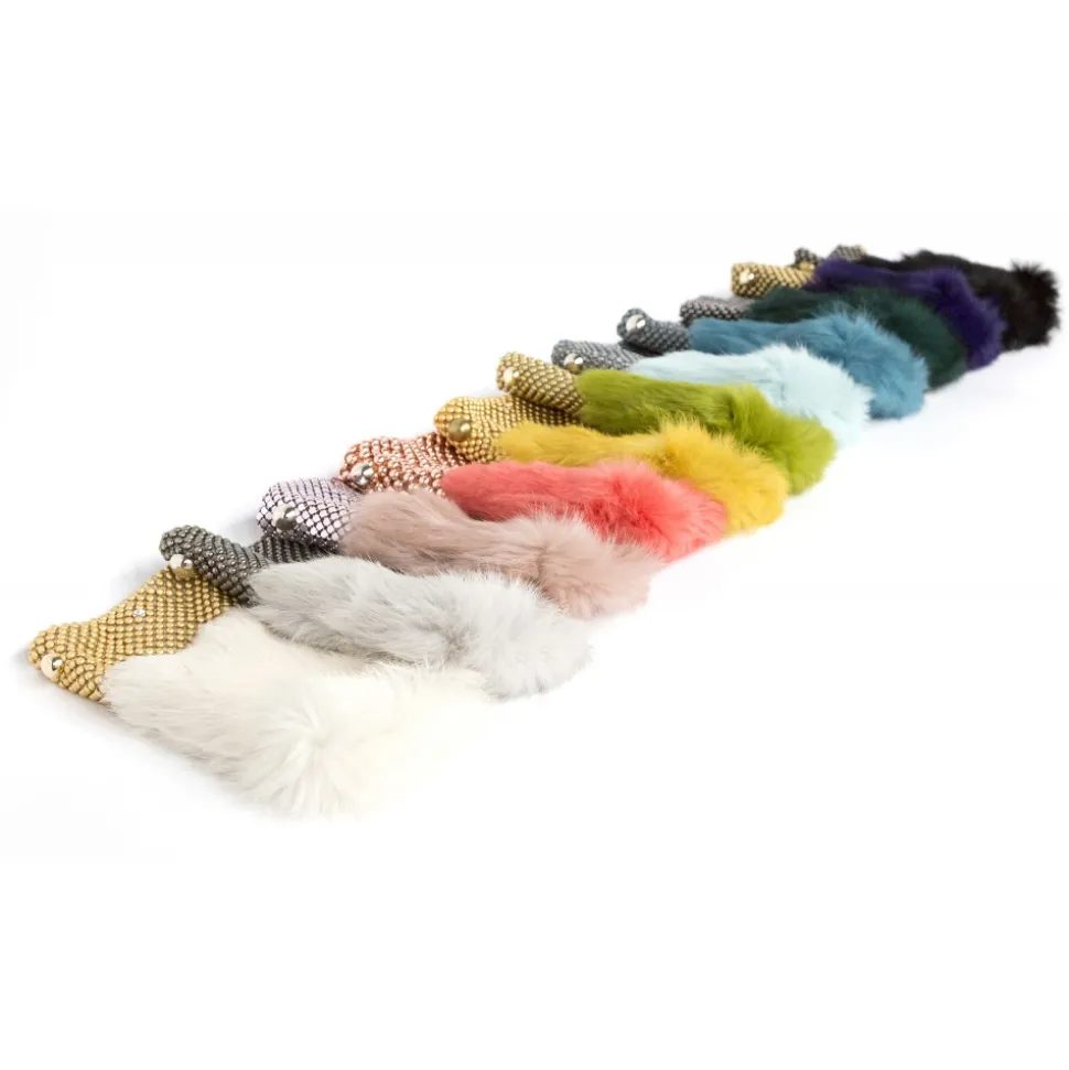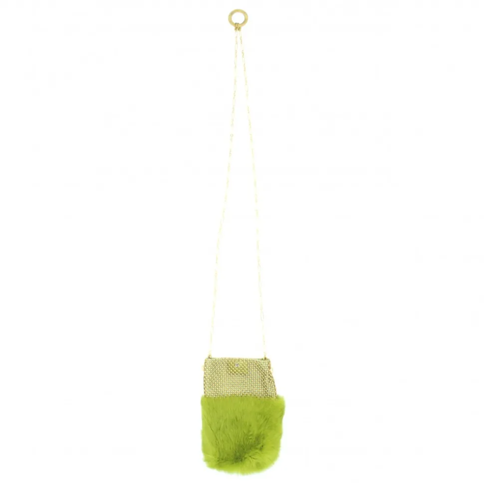 Green lapin fur and gold mesh. One green Swarovski crystal detail. Green nappa lining. Snap button closure. 64 cm long gold plated chain strap.