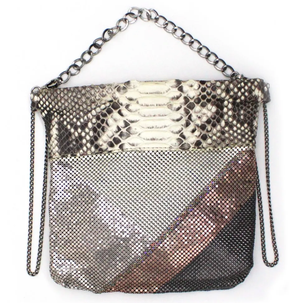 Natural python – Rose, silver, white. Interior zipped pocket. Detachable chain strap.