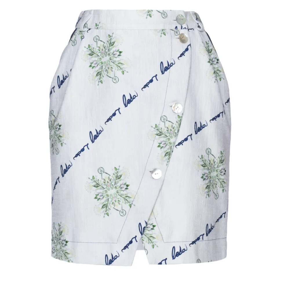 Ania. “Leda” skirt in cotton with print. Logo buttons “hidden” button in the right strap.