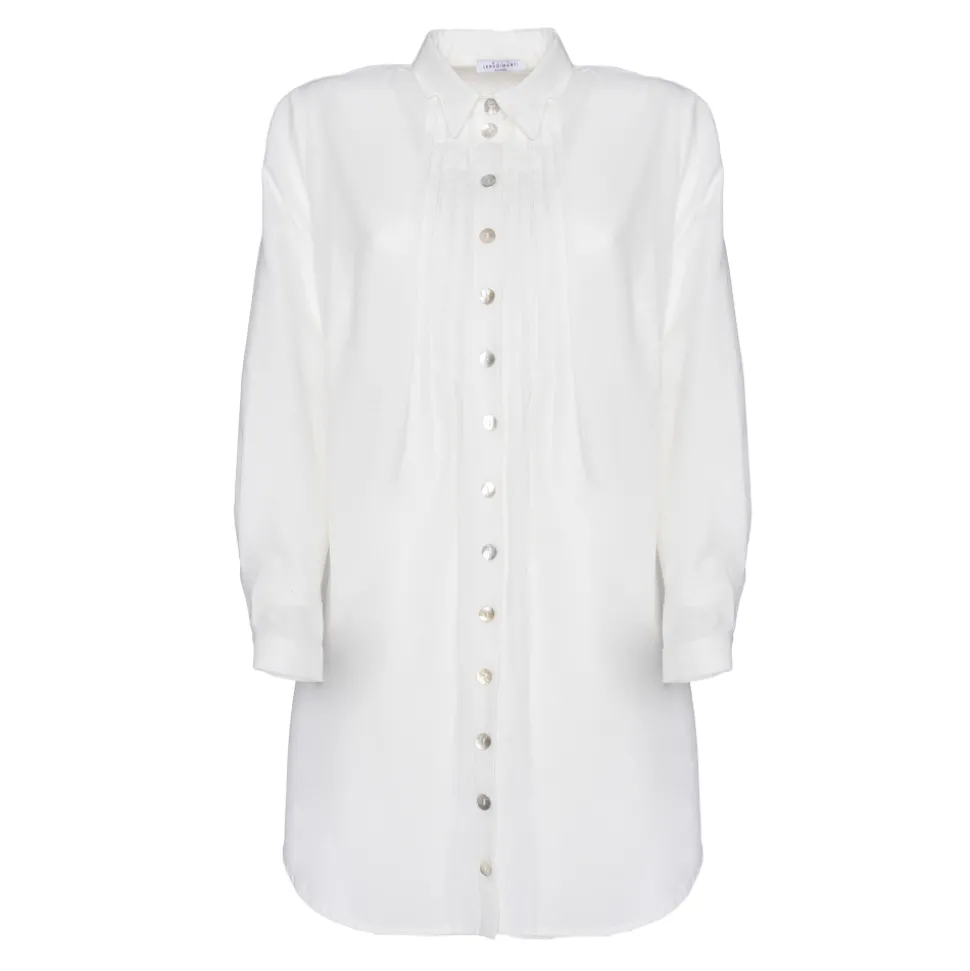 Camid. Large sized shirt in natural white with ruffle details on the front and logoed buttons.