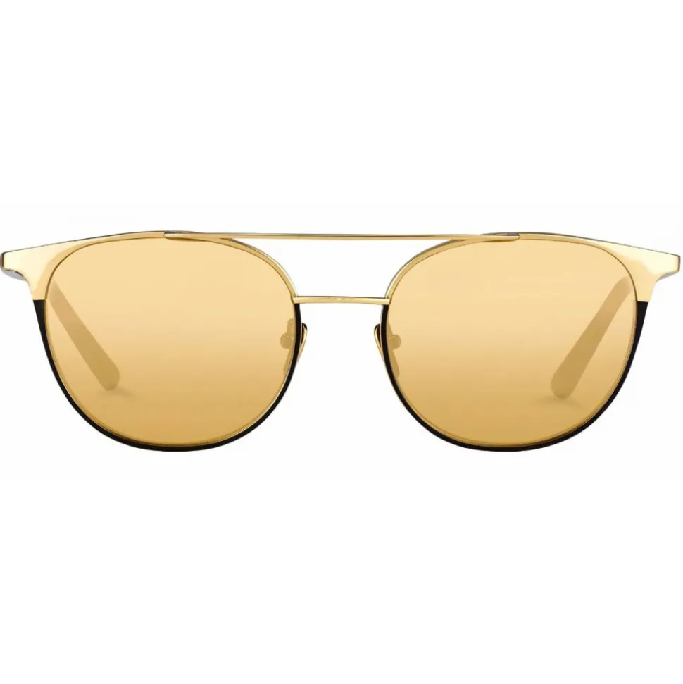 Giving the iconic browline sunglasses a luxurious twist, these sunglasses from Linda Farrow are crafted from black and 18-22 carat gold-plated titanium. Framing the gold precious lenses into a winged top frame, the sunglasses are detailed with a straight double nose bridge.