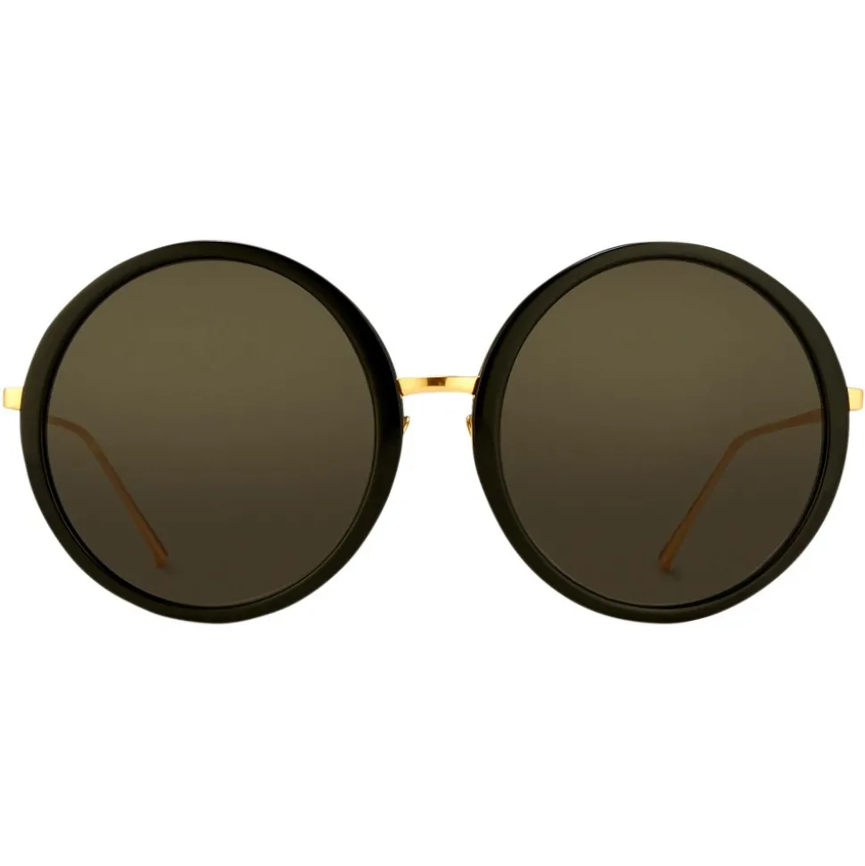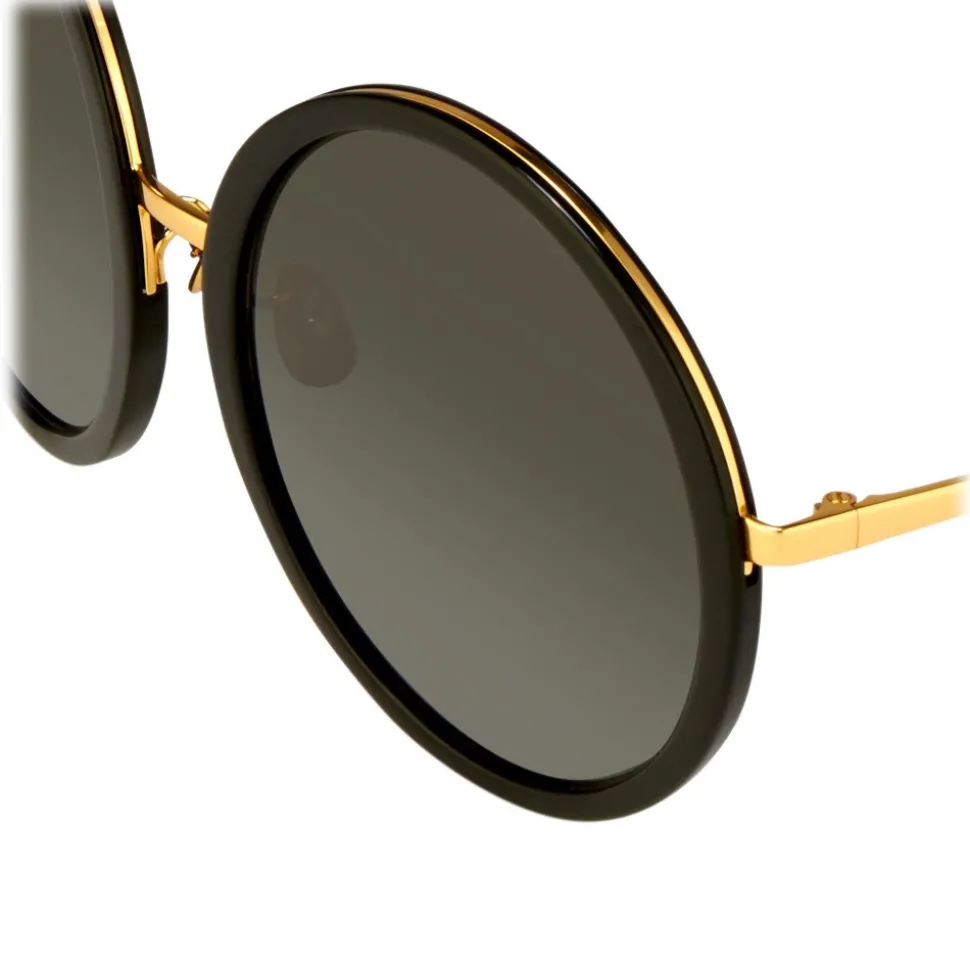 Elegant Linda Farrow round sunglasses handcrafted from Japanese acetate in black, with metal running behind the framework for added strength. With grey solid nylon lenses, these sunglasses are accented with contrasting 18-22 carat gold-plated slim titanium temples, finished with signature raised pin details.