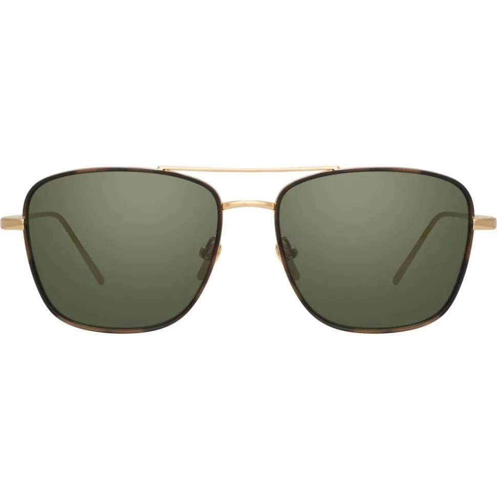 Taking influence from Slim Aarons’ portraits of the international elite in their exclusive poolside playgrounds, these men’s rectangular aviator sunglasses are crafted from luxurious 18-22 carat yellow gold-plated hypoallergenic lightweight titanium. Dark green nylon lenses are given a sophisticated contrasted with tortoiseshell Italian acetate inner windsor rims.