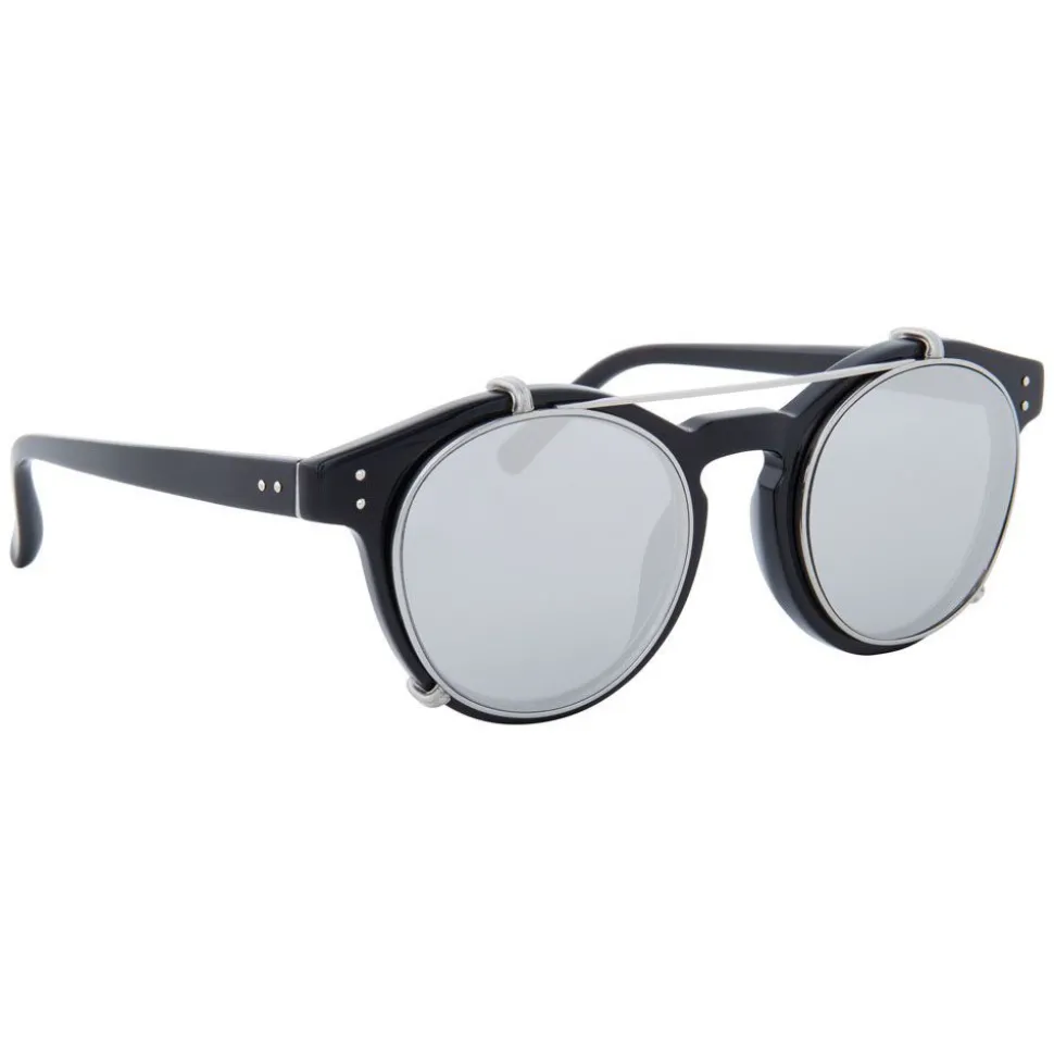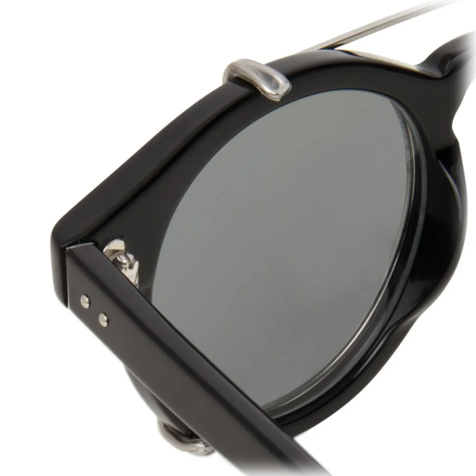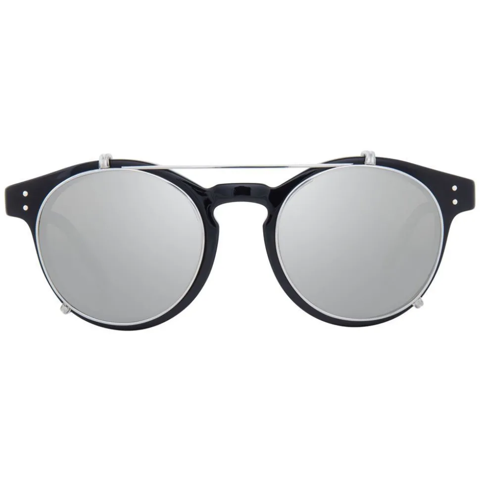 Elevating optical glasses with an innovative clip-on sunglasses feature, these rounded keyhole glasses are the epitome of modern luxury. In a timeless combination of black and white gold, these glasses feature flat platinum precious lenses with an 18-22 carat white gold plated titanium top bar and clips that attach to hand polished black Italian acetate frames.