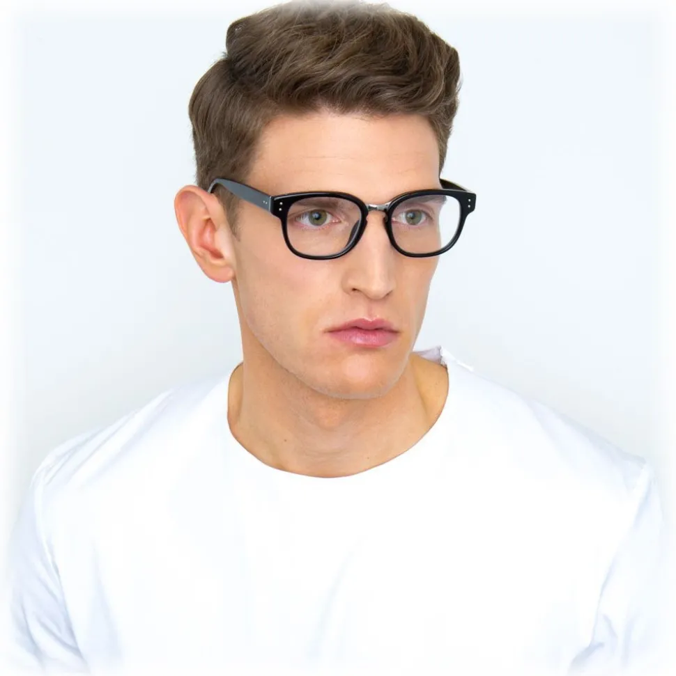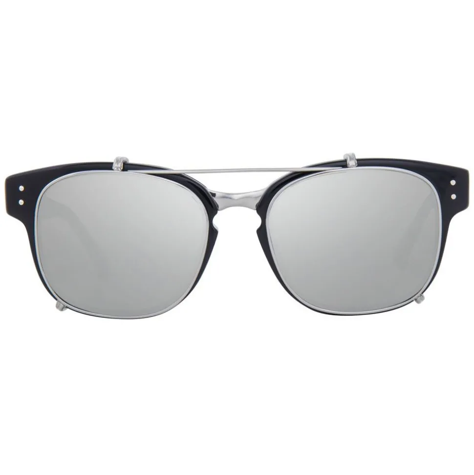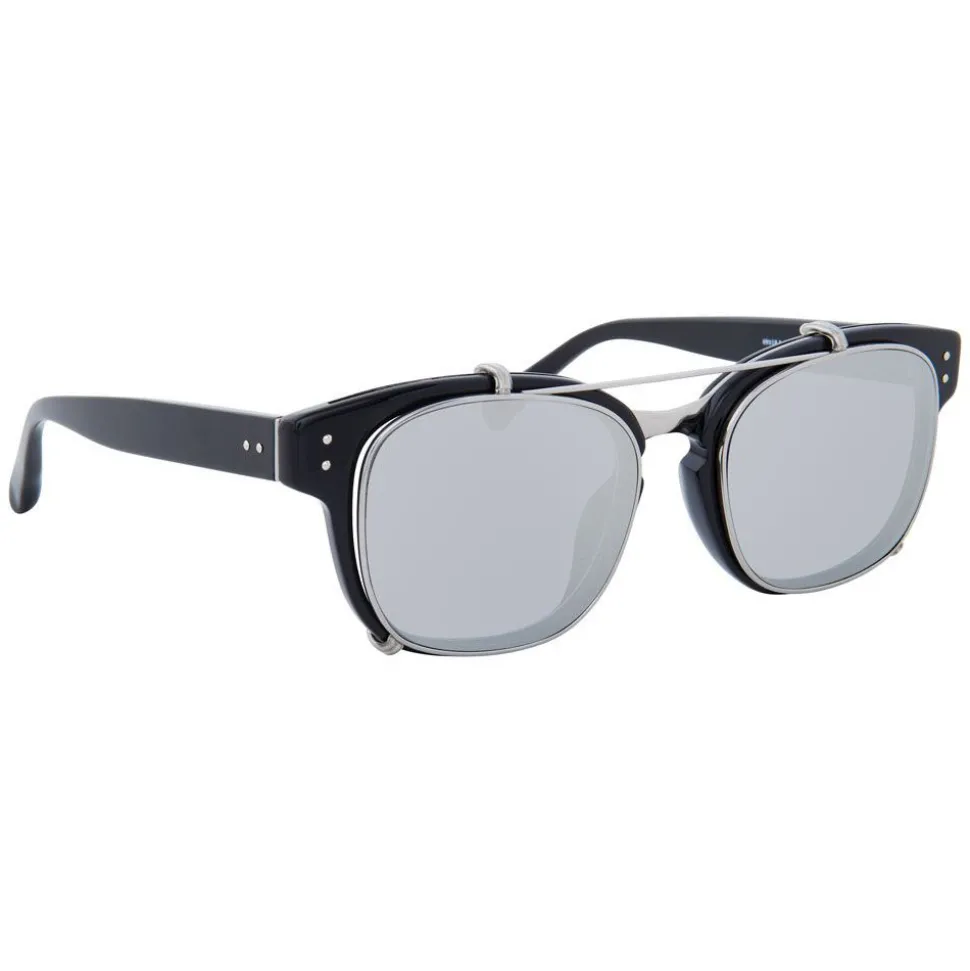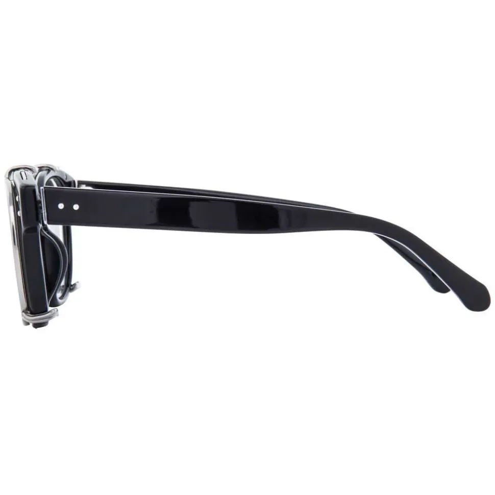 Combining innovative details with luxury design, these unique rectangular dual glasses bring together optical lenses with a clip-on sunglasses feature. Flat platinum precious lenses with 18-22 carat white gold plated titanium top bar and clips attach to hand polished black Italian acetate frames.