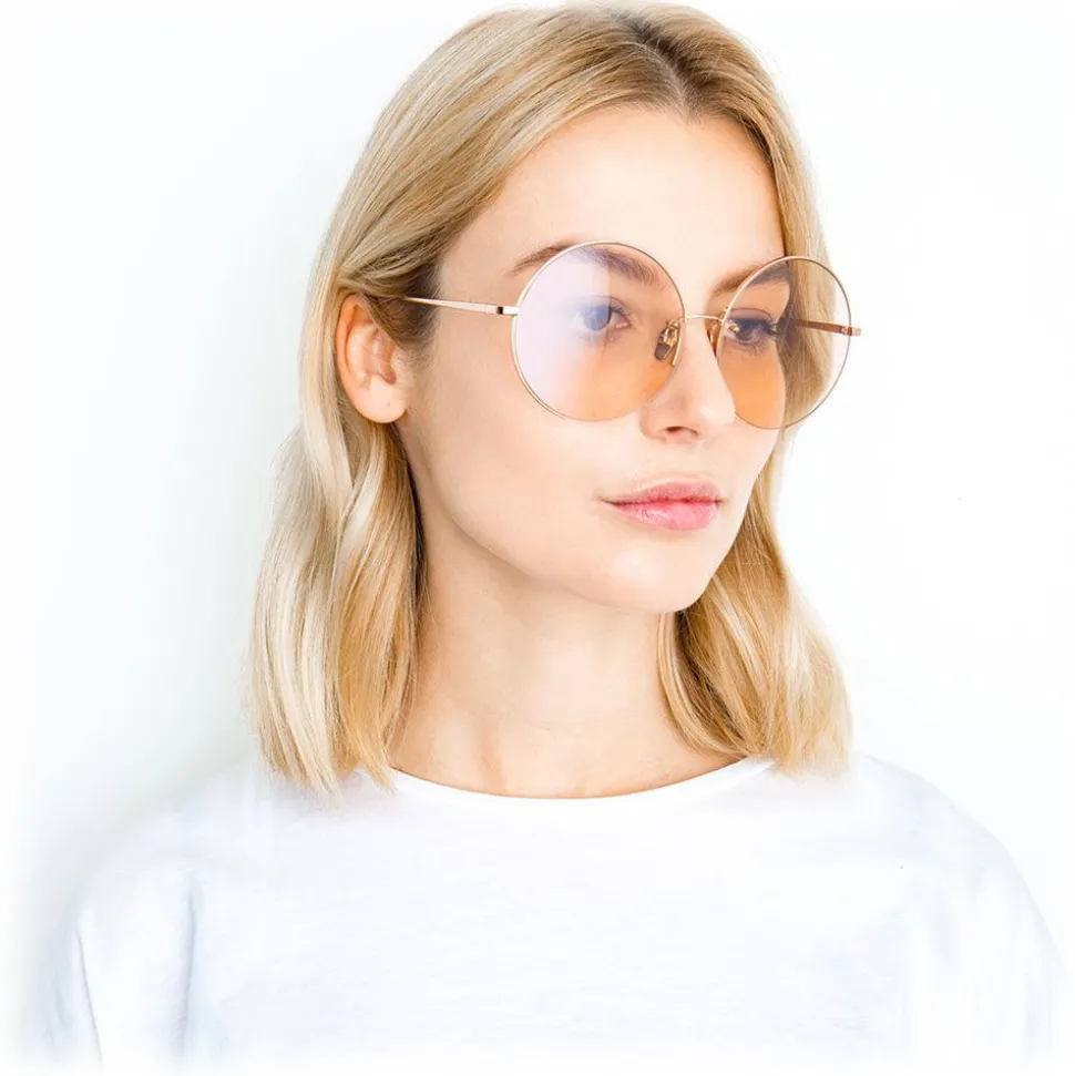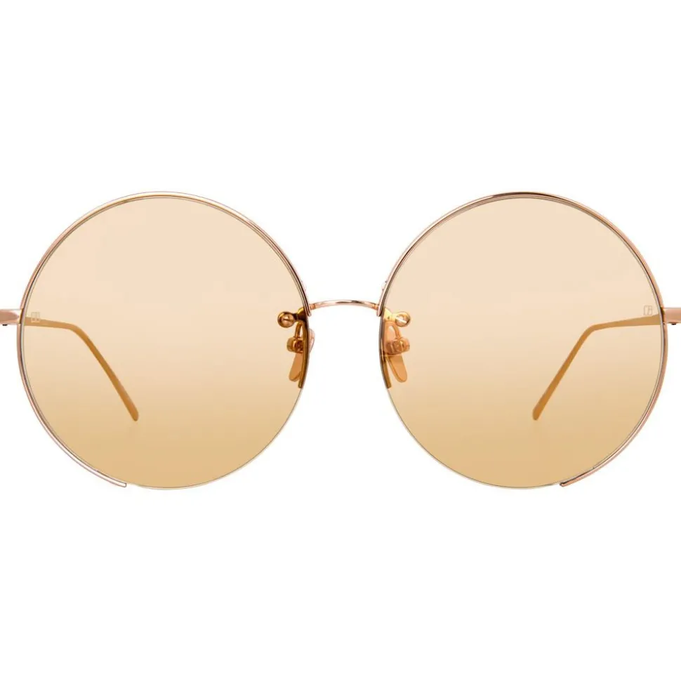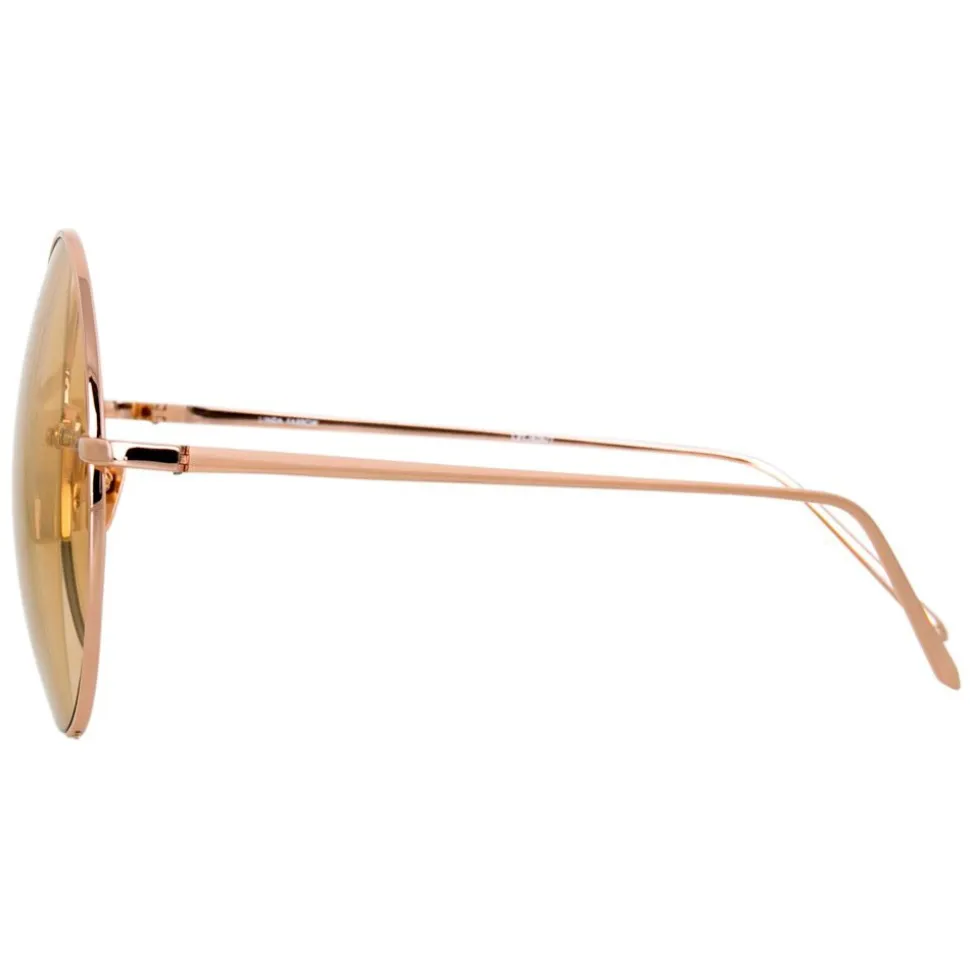 Imbued with a sense of glamour and elegance, these luxurious round Linda Farrow aviator sunglasses are handcrafted entirely from 18 – 22 carat rose gold-plated lightweight titanium with contrasting peach nylon lenses.