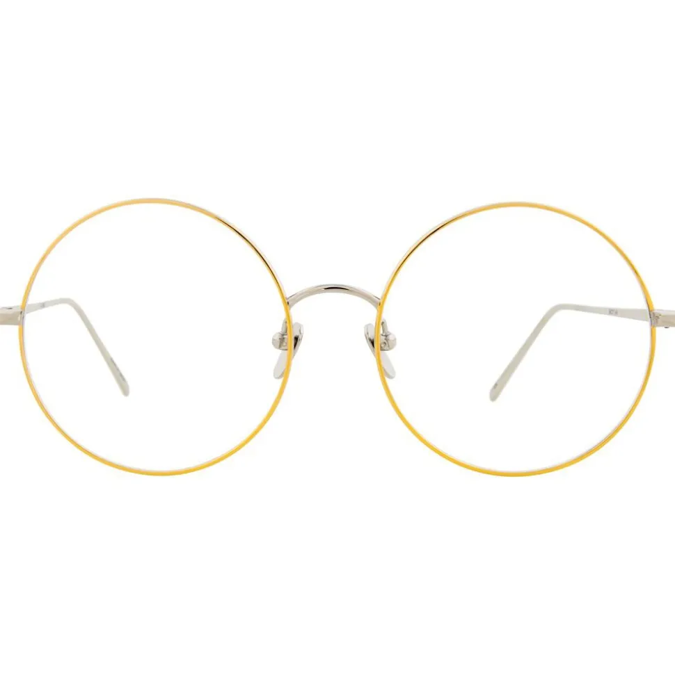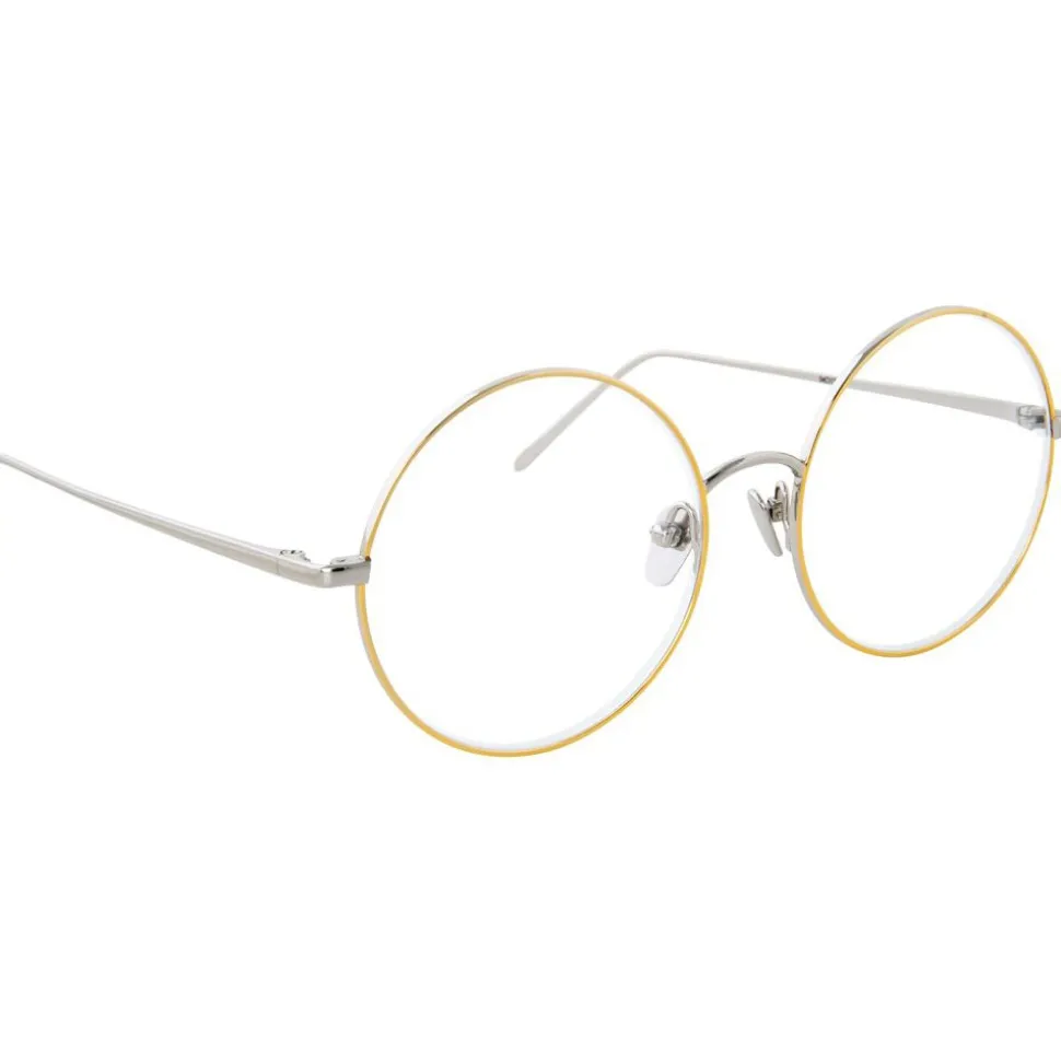 In a retro-inspired round silhouette, these luxurious Linda Farrow optical glasses are crafted by hand entirely from 18-22 carat white gold-plated lightweight titanium. Contrasted with a 18 – 22 carat yellow gold-plated rim to the front, these imitable glasses are complete with tapered temples with Japanese bulb tips, adjustable nose pads and the Linda Farrow logo in signature white.