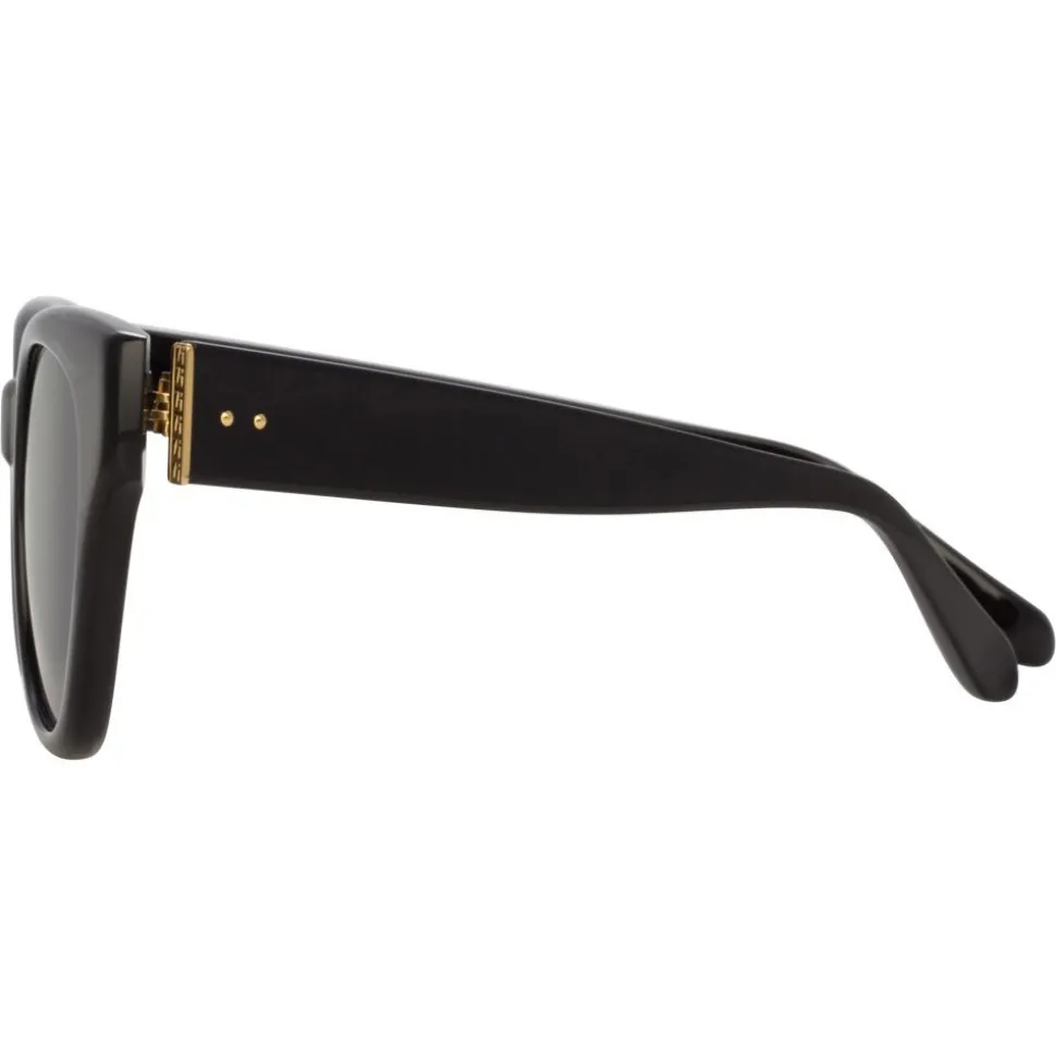 Inspired by the glamour of the jet set photographed by Slim Aarons, these unisex classic D-Frame Linda Farrow sunglasses are crafted from chunky black Italian acetate, heavily bevelled for a luxurious finish. With co-ordinating dark grey nylon lenses, characteristic finishes include yellow gold-plated temple capping and raised pin details, as well as tapered temples for superior comfort.