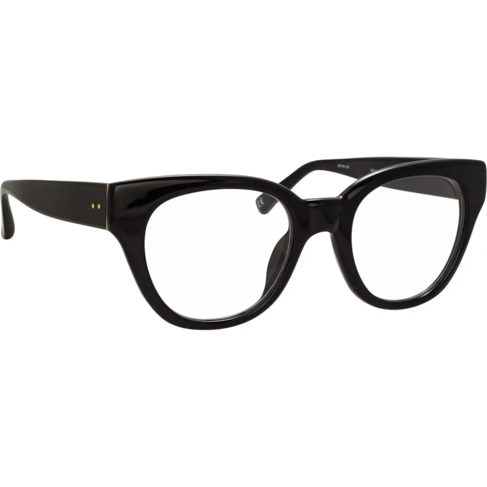 In a classic D-Frame silhouette reimagined in chunky luxurious black Italian acetate, these unisex Linda Farrow optical glasses are heavily bevelled and detailed with yellow gold-plated temple capping and raised pin details for a luxurious finish. Tapered temples provide superior comfort.